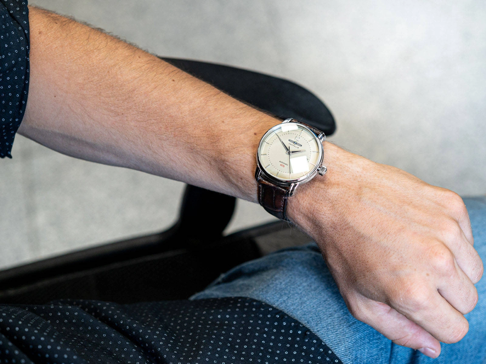 ZEPPELIN 8160-5 LZ127 Bodensee nawiązuje do epoki lotnictwa i podróży sterowcami, emanując duchem przygody i historii. Przy godzinie 3 umieszczony jest datownik, wskazujący aktualny dzień miesiąca. Srebrna błyszcząca koperta wykonana jest ze stali szlachetnej. Jej proporcje są zbalansowane, a wykończenie dbałością o detale nadaje zegarkowi unikalny wygląd. Beżowa tarcza ma wyraźne oznaczenia i kontrastujące wskazówki. Mechanizm automatyczny samonakręca się poprzez ruch nadgarstka, eliminując potrzebę regularnej zmiany baterii. Przeźroczysty dekiel z tyłu koperty pozwala obserwować pracę mechanizmu, co jest fascynującym doświadczeniem dla miłośników zegarków. Eleganckie pudełko dołączone do tego modelu sprawia, że zegarek może stać się idealnym pomysłem na prezent.
