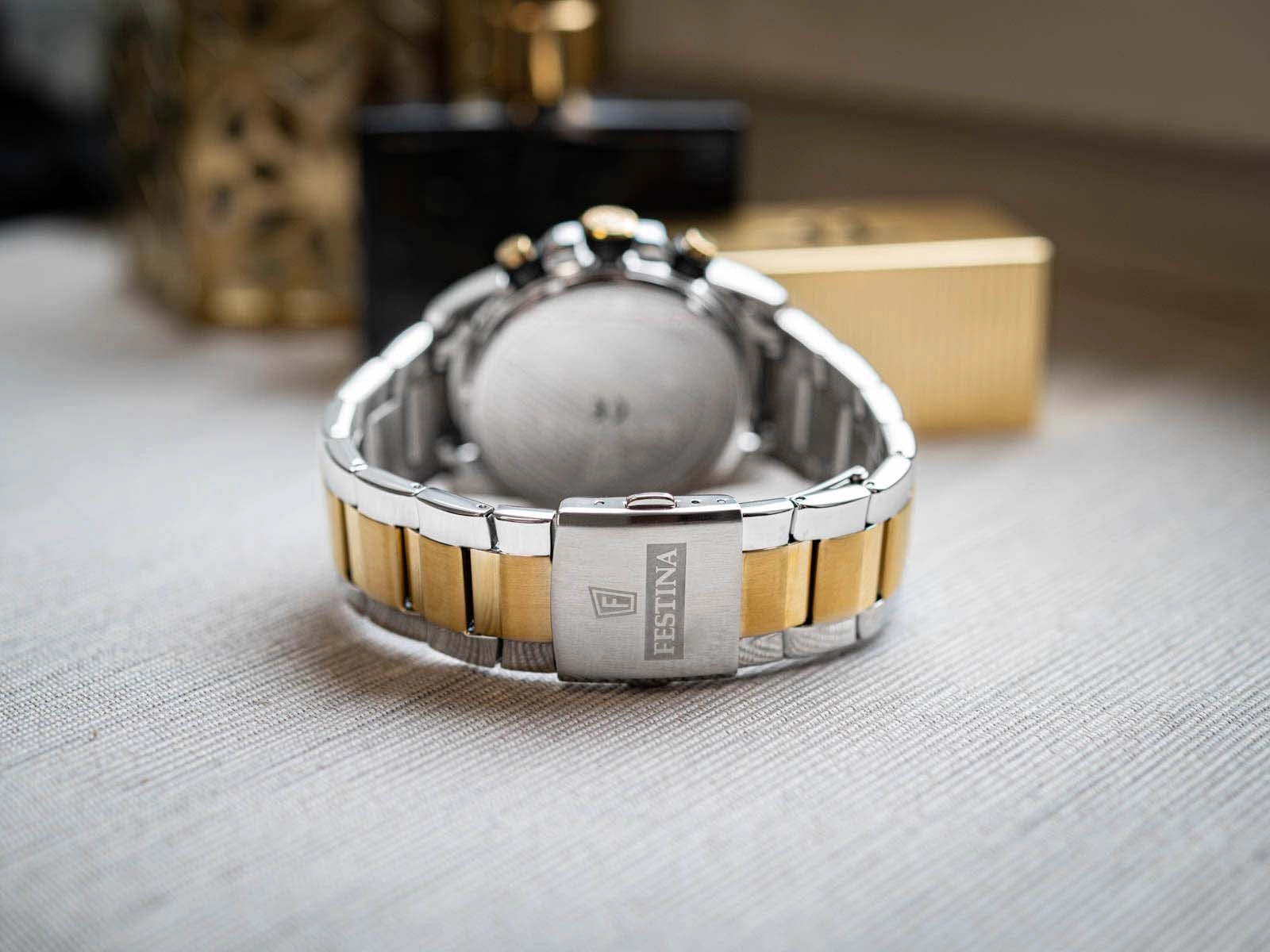 • Wodoszczelny Zegarek Męski Festina F20562/3 srebrno-złoty na bransolecie, posiada funkcje takie jak stoper i datownik.