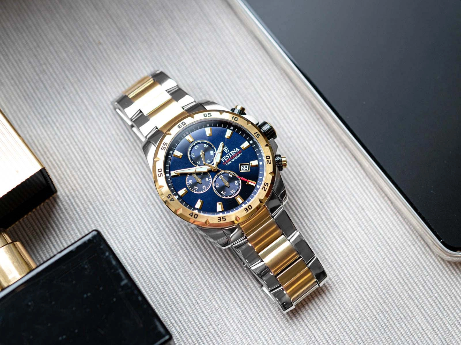 • Wodoszczelny Zegarek Męski Festina F20562/2 srebrno-złoty na bransolecie, posiada funkcje takie jak stoper i datownik.