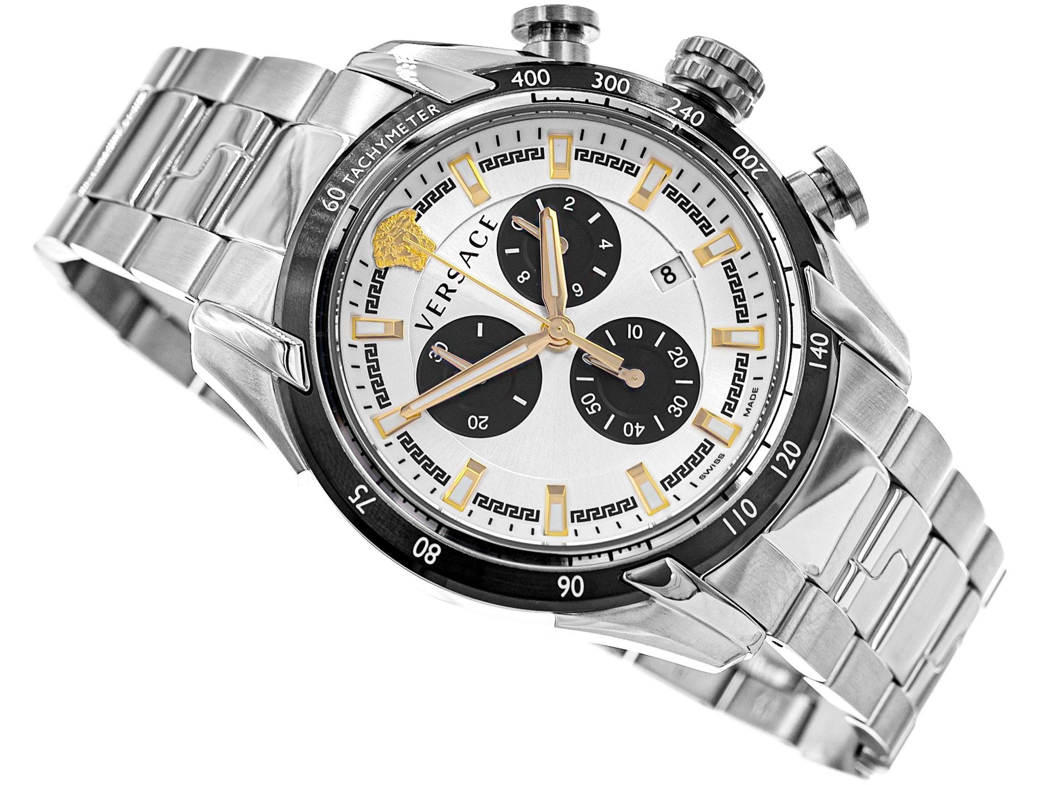 - Zegarek Męski Versace VE2I00321 srebrny na bransolecie, posiada funkcje takie jak stoper i datownik.