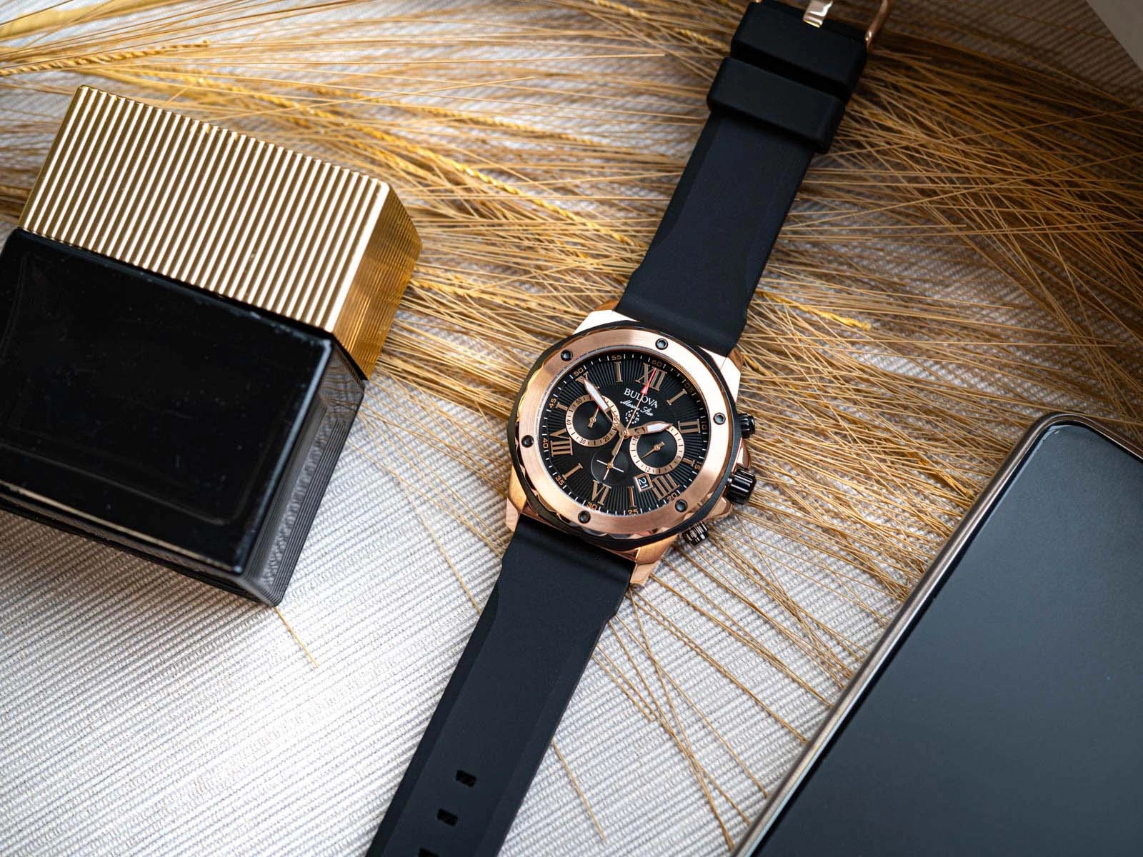 - Wodoszczelny Zegarek Męski Bulova 98B104 czarny na pasku, posiada funkcję stopera.