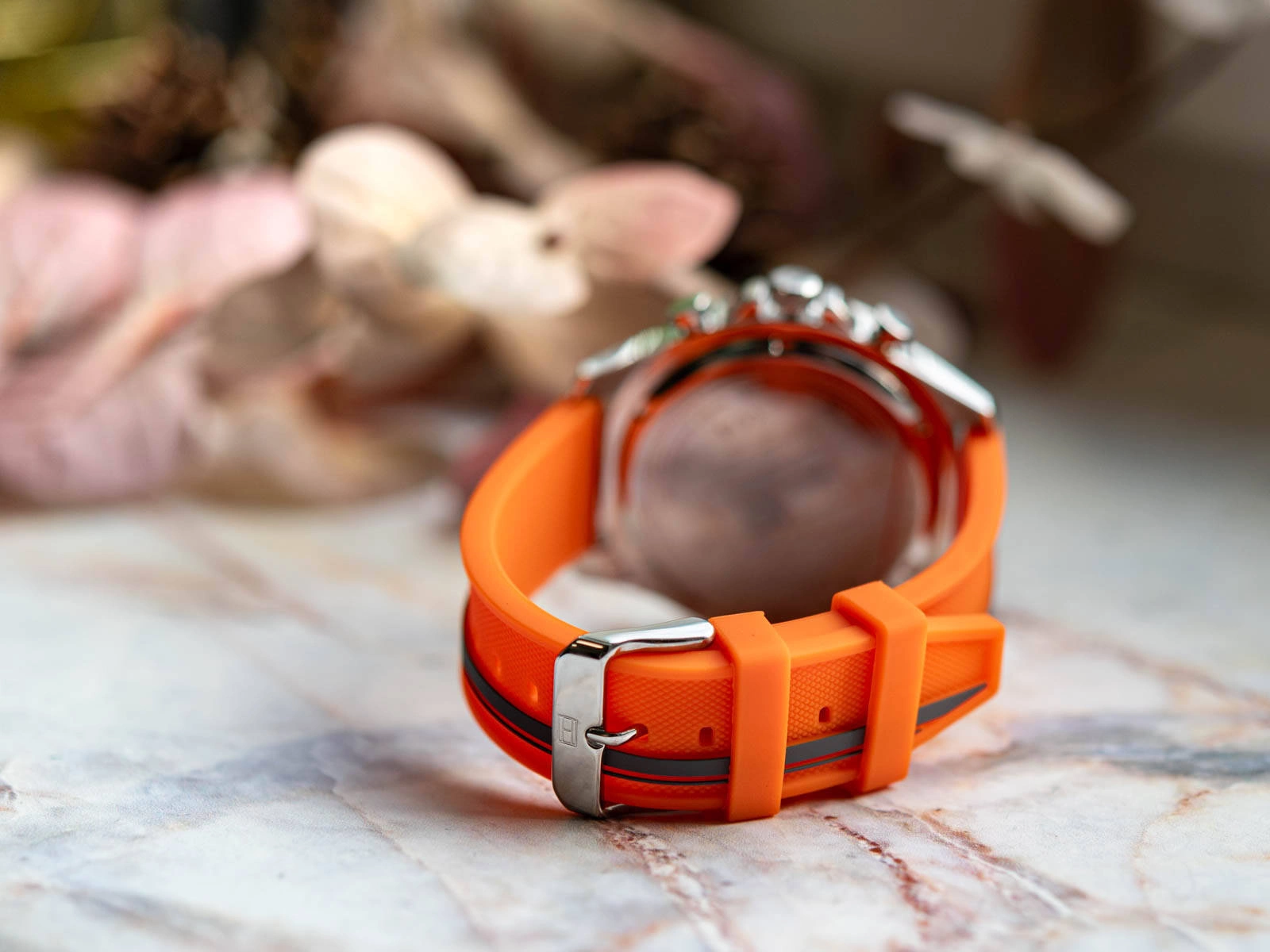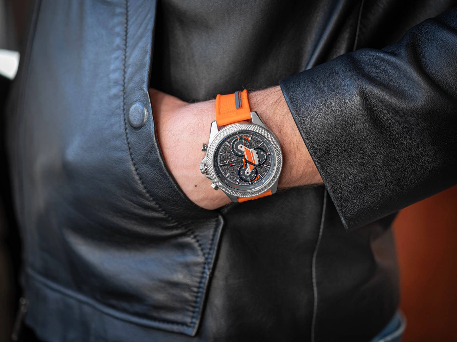 - Zegarek Męski Tommy Hilfiger 1792084 pomarańczowy na pasku, z rozbudowanym datownikiem.