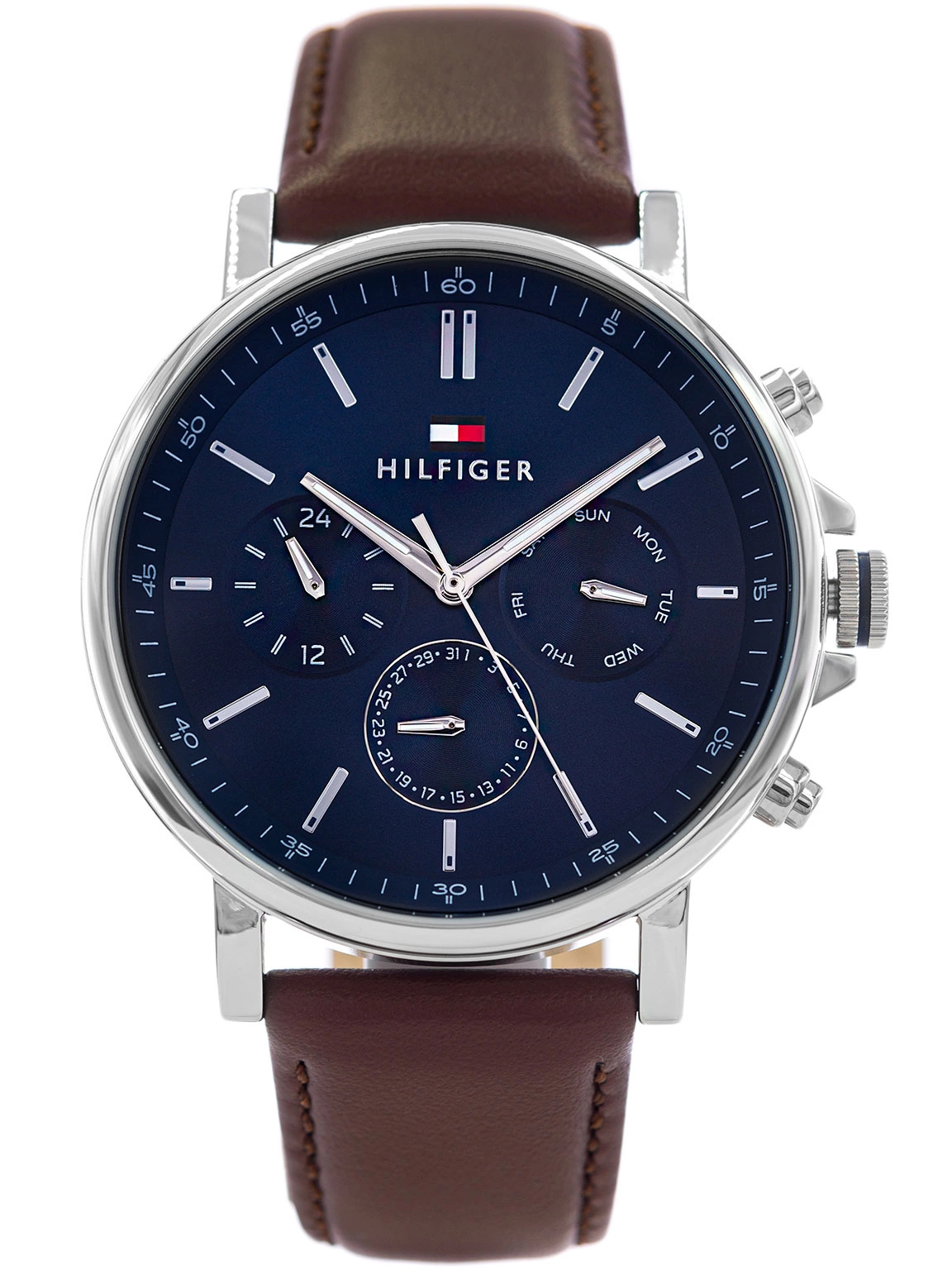 • Zegarek Męski Tommy Hilfiger 1710585 brązowy na pasku, posiada funkcję datownika.