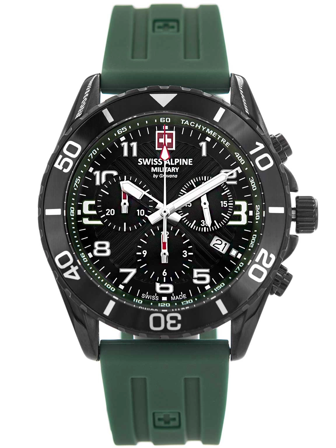- Wodoszczelny Zegarek Męski Swiss Alpine Military SAM7029.9874 zielony na pasku, posiada funkcje takie jak stoper i datownik.