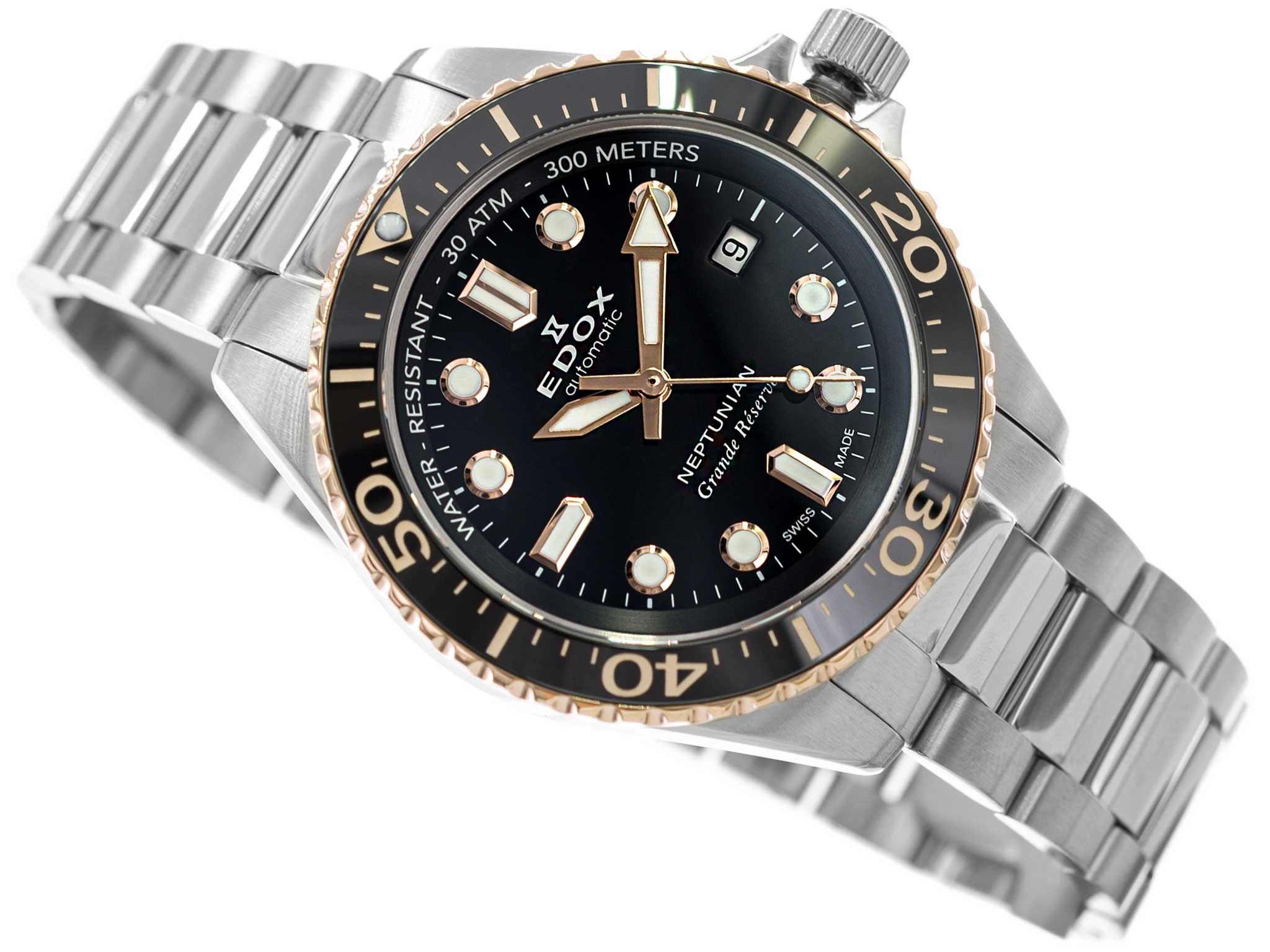 Edox 80801 3NRM NIR Neptunian Grande Reserve to połączenie niezawodności oraz ciekawego wyglądu. Bez wątpienia przypadnie do gustu osobom lubiącym wodne sporty ekstremalne jakim jest np. nurkowanie. Imponująca klasa wodoszczelności 300M umożliwia pływanie z zegarkiem na ręku bez obaw o jego uszkodzenie. Dzięki obracanemu bezelowi możemy kontrolować czas spędzany pod wodą, a dokręcana koronka zapewni bezpieczeństwo przed zalaniem mechanizmu. Wskazówki oraz indeksy zostały pokryte farbą fluorescencyjną, która ułatwia odczyt danych tam, gdzie dostęp światła jest utrudniony. Cyferblat chroniony jest przez niezwykle odporne na uszkodzenia szkło szafirowe. Połączenie kolorystyczne Edox Grande Reserve czyni ten model eleganckim i pasującym do wielu stylizacji. Świetnie sprawdzi się również na co dzień. Precyzja oraz innowacyjność sprawiają, że to niezaprzeczalnie wyróżniający się czasomierz. Zegarek zapakowany jest w dedykowane pudełko producenta, które idealnie sprawdzi się jako opakowanie na prezent.