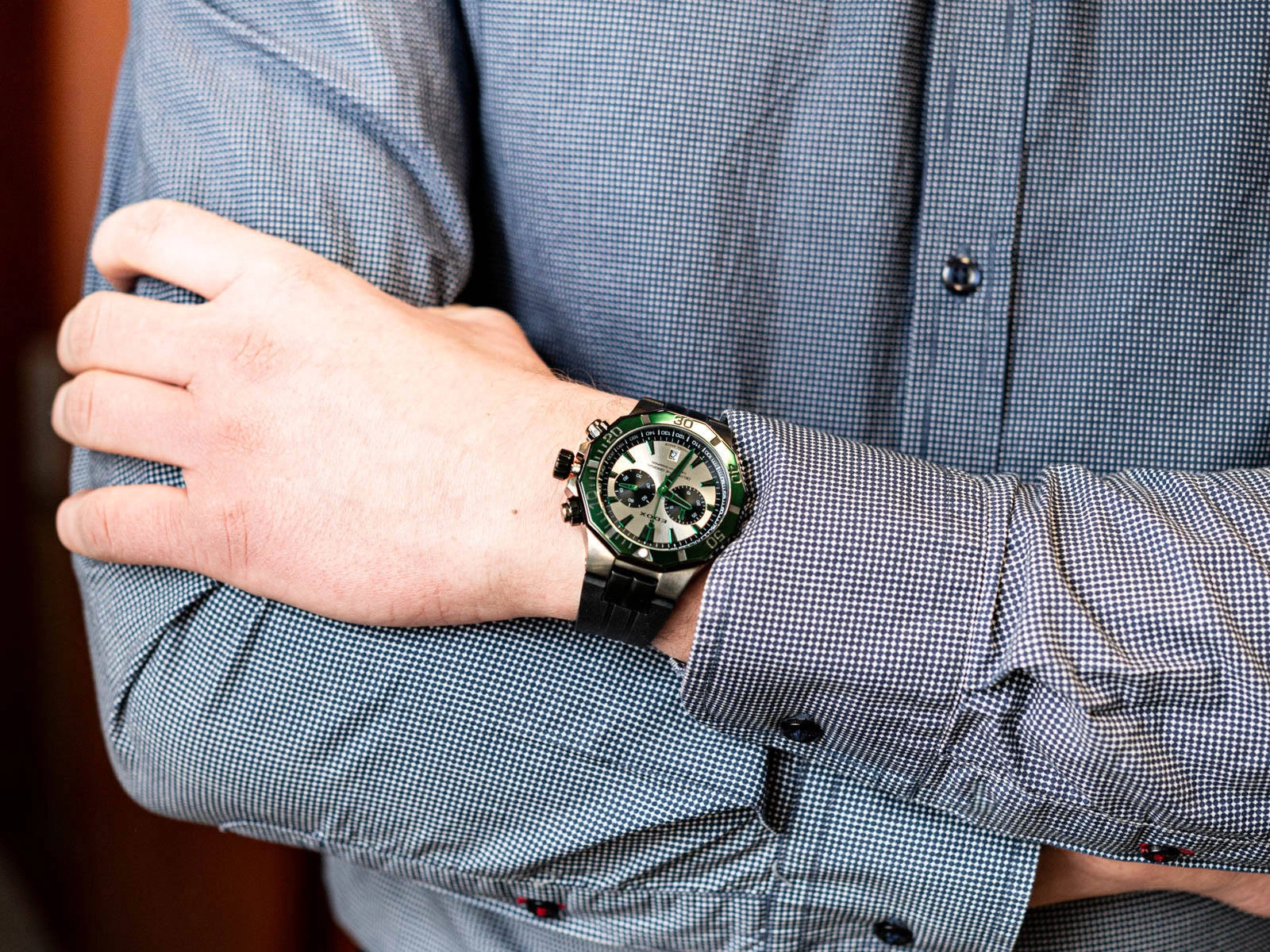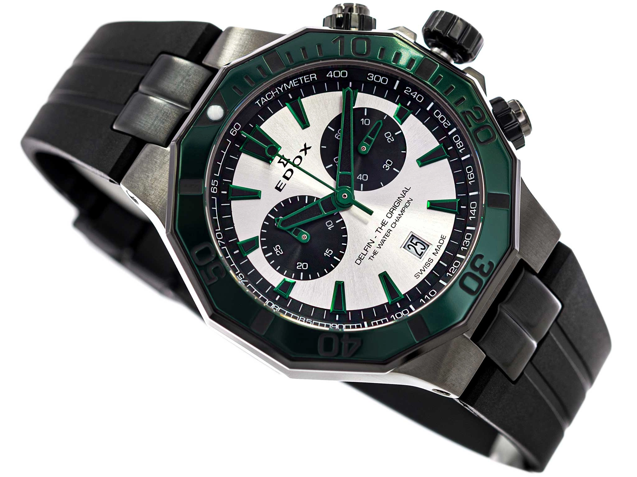 EDOX Delfin 10112 37GNVCA ANV to model, który łączy w sobie funkcjonalność oraz niespotykany wygląd. Zaprojektowany w sportowym stylu sprawdzi się podczas różnych aktywności fizycznych. Stalowa, charakterystyczna dla marki koperta została połączona z paskiem z tworzywa sztucznego, który jest niezwykle wygodny i dopasowuje się do nadgarstka. Srebrny cyferblat wraz z zielonymi indeksami sprawia, że tarcza jest przejrzysta i nie sprawia problemu z odczytem danych. Oprócz oryginalnej prezencji model ten posiada również szereg funkcji. Datownik zlokalizowany przy godzinie 6 pozwala na śledzenia aktualnego dnia miesiąca. Stoper analogowy pomoże w pomiarze czasu do 30 minut. Dodatkowo wysoka klasa wodoszczelności 20ATM pozwala na pływanie w zegarku na ręku, dzięki czemu idealnie sprawdzi się podczas uprawiania sportów wodnych. EDOX Delfin to idealny model dla miłośników aktywności fizycznej, przede wszystkim sportów wodnych. Równie dobrze będzie prezentował się podczas codziennych czynności. Zegarek zapakowany jest w eleganckie czarne opakowanie, które stanowi świetny pomysł na prezent.