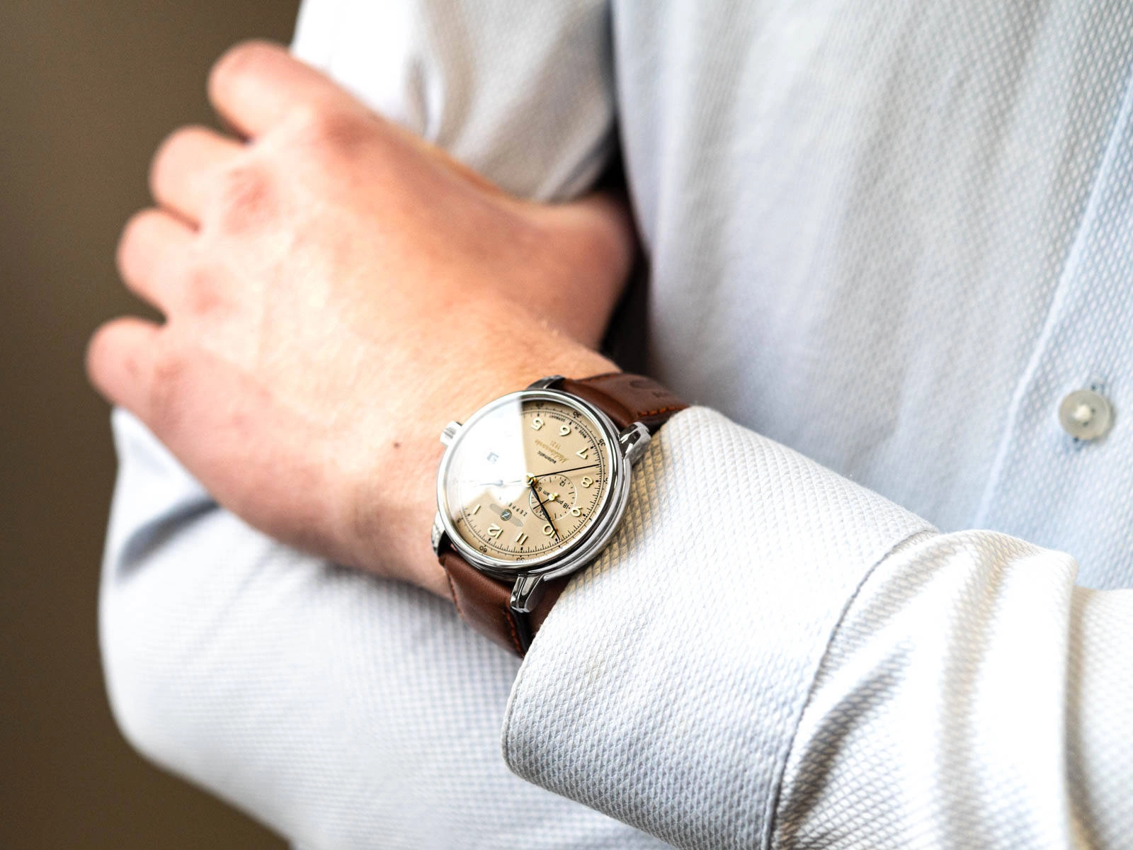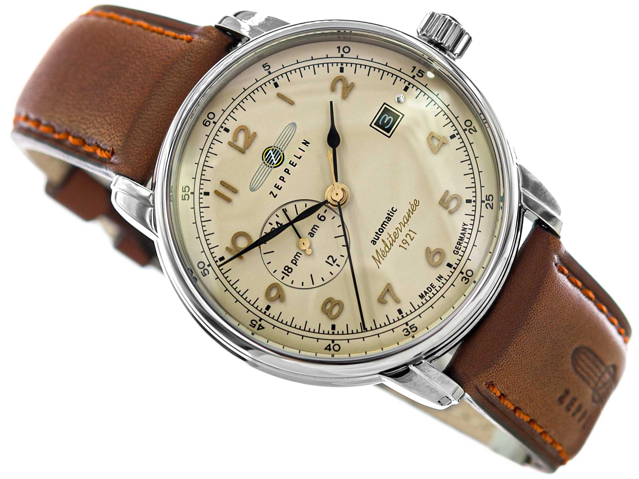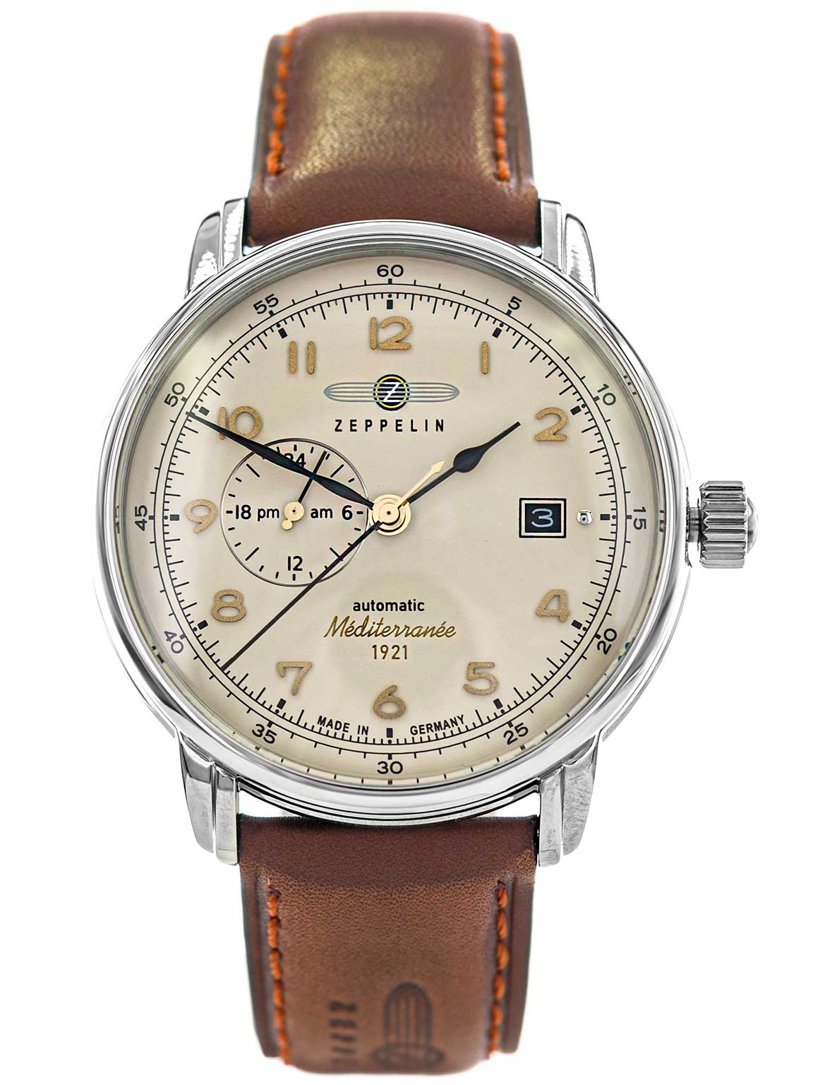 ZEPPELIN 9668-5 Mediterranee bardzo elegancko prezentuje się na męskim nadgarstku za sprawą idealnie dobranej kolorystki oraz unikalnego designu. Stalowa koperta została zawieszona na skórzanym, cielęcym pasku, który jest niezwykle wygodny i dopasowuje się do dłoni. Na beżowym cyferblacie umieszczono złote indeksy w postaci cyfr arabskich, dzięki czemu odczyt godziny nie sprawia problemów. Wypukłe szkło mineralne chroniące tarczę gwarantuje odporność na czynniki zewnętrzne. Model ten funkcjonuje w oparciu o mechanizm automatyczny - będzie pracował w momencie noszenia go na nadgarstku. Zaletą jest możliwość dokręcenia go ręcznie za pomocą koronki. Wbudowany multidatownik wskazuje datę oraz czas w formacie 24 godzinnym. Zeppelin Mediterranee to świetny wybór dla mężczyzn ceniących sobie klasyczny wygląd dodatków oraz ich najwyższej jakości wykonanie. Zegarek może stać się idealnym pomysłem na prezent za sprawą eleganckiego pudełka.