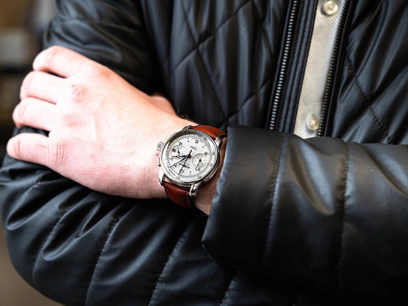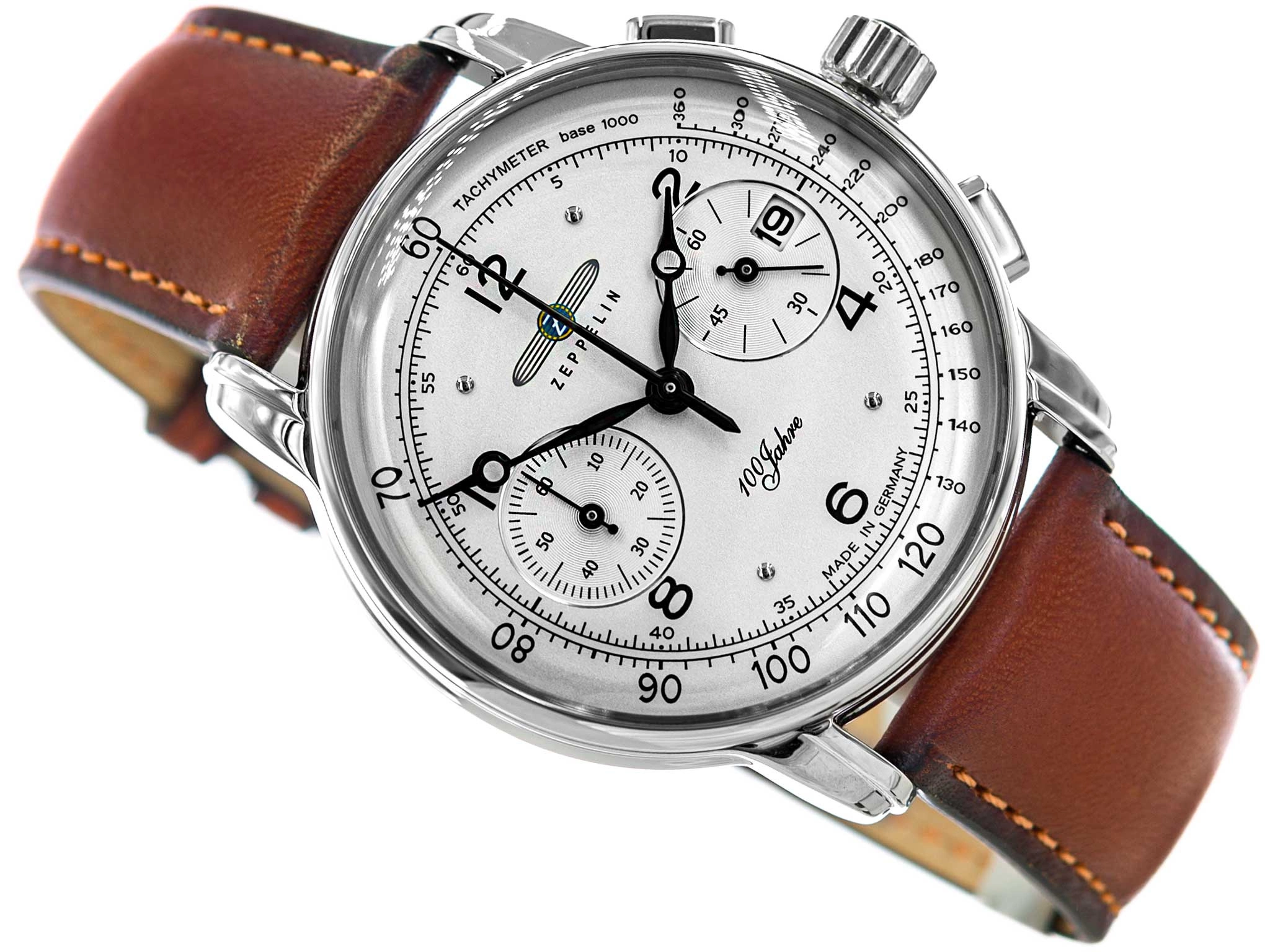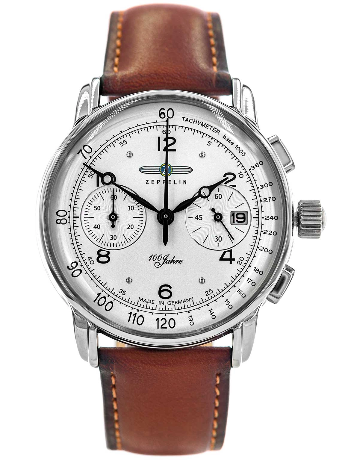 ZEPPELIN 8676-1 100 Jahre wyróżnia się solidnym wykonaniem oraz niebywale eleganckim designem. Czasomierz pracuje w oparciu o precyzyjny i niezawodny mechanizm kwarcowy. Stalowa koperta została połączona z miękkim, skórzanym paskiem w kolorze brązowym, który świetnie leży na nadgarstku. Srebrny cyferblat prezentuje czarne indeksy i wskazówki, które tworząc kontrast sprawiają, że odczyt godziny nie sprawia problemu. Tarcza została wyposażona w przydatne funkcje. Datownik umieszczony przy godzinie 3 wskazuje aktualny dzień miesiąca, a stoper analogowy odmierza czas do 60 minut, obsługuje się go za pomocą bocznych przycisków. ZEPPELIN 8676-1 to zegarek wysokiej klasy, świadczą o tym wysokiej jakości komponenty i staranność wykonania. To wszystko składa się na ponadczasowy model, który fantastycznie będzie współgrał z każdą stylizacją i stanie się towarzyszem na co dzień. Czasomierz pakowany jest w eleganckie pudełko, co czyni ten produkt idealnym pomysłem na prezent.