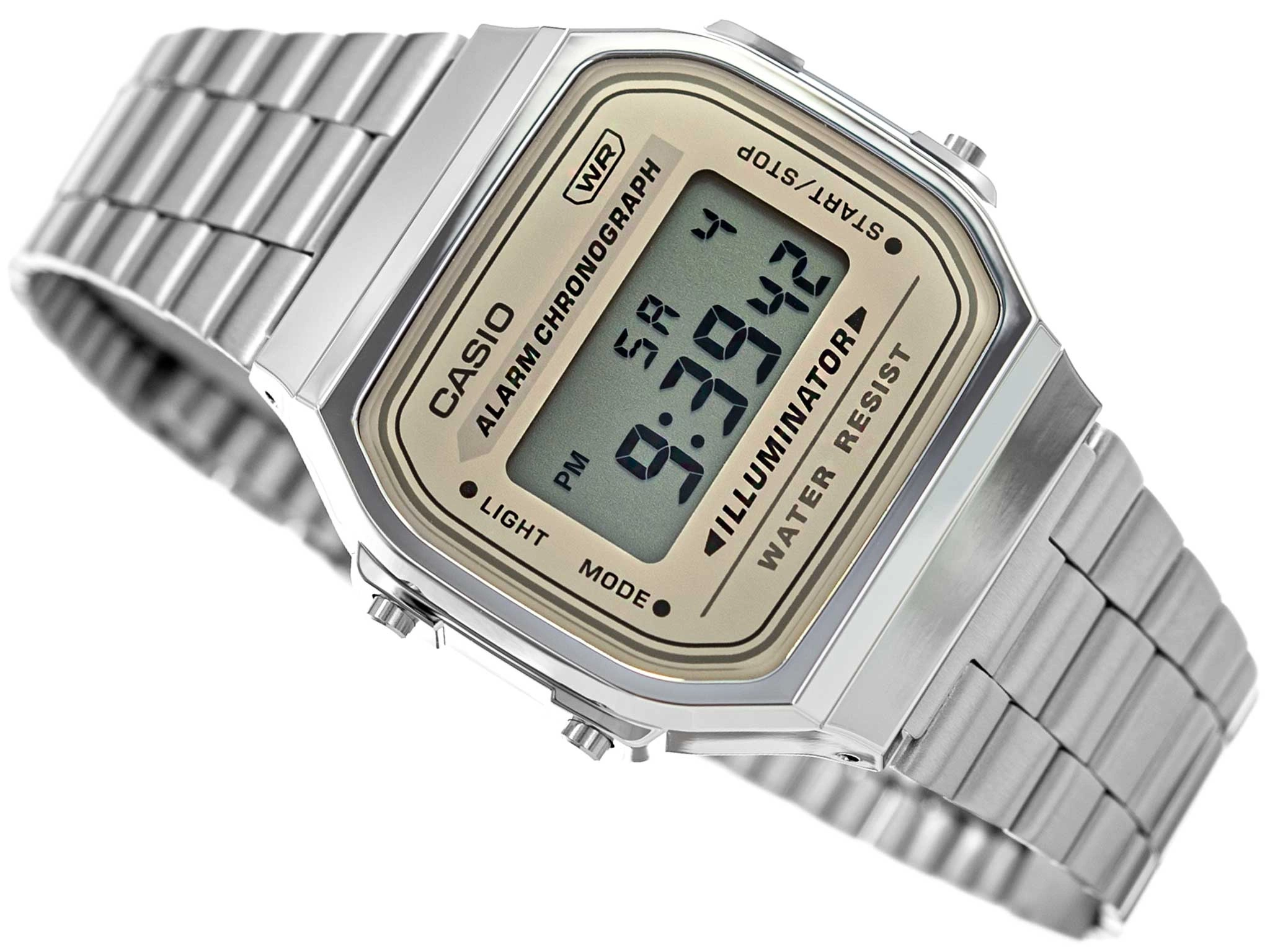 - Zegarek Casio A168WA 8A srebrny na bransolecie, posiada funkcje takie jak stoper i datownik.