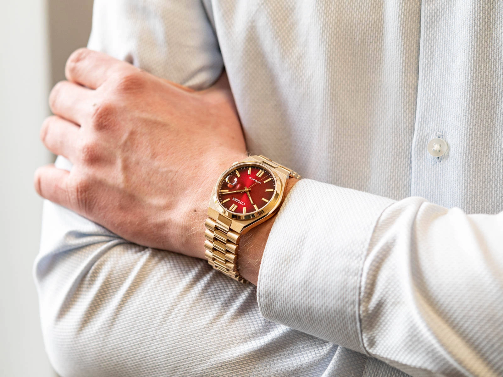 Citizen Automatic Tsuyosa NJ0153-82X jest wyjątkowym czasomierzem, który łączy stylowy design z nowoczesnością. Luksusowy wygląd zapewnia złota bransoleta oraz koperta wykonana ze stali nierdzewnej. Użyte materiały gwarantują także trwałość i odporność na codzienne użytkowanie. Czerwony cyferblat jest odważnym, lecz zarazem wyrafinowanym akcentem, z pewnością przyciągającym uwagę i uzupełniającym każdą stylizację. Ułatwienie odczytu czasu zapewniają indeksy liniowe. Natomiast zastosowanie szkła szafirowego gwarantuje wysoką odporność na zarysowania. Dodatkową funkcją jest datownik, wzbogacony o szkiełko powiększające, umożliwiające szybkie sprawdzenie aktualnej daty. Citizen Tsuyosa NJ0153-82X stanowi idealny wybór dla mężczyzn poszukujących ekskluzywnego zegarka z charakterem.