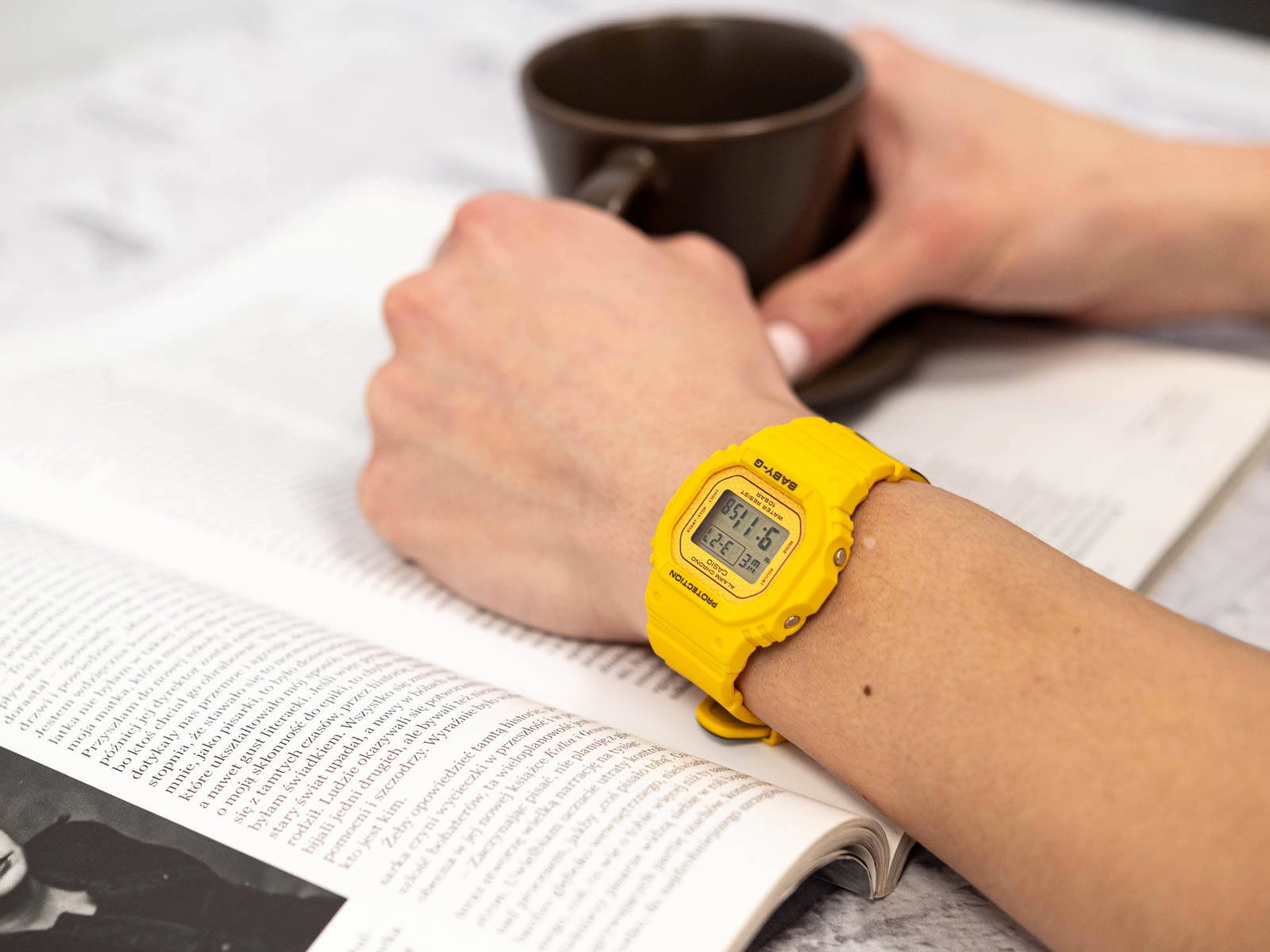 - Wodoszczelny Zegarek Damski Casio Baby-G BGD-565SLC-9ER żółty na pasku, posiada funkcje takie jak stoper i datownik.