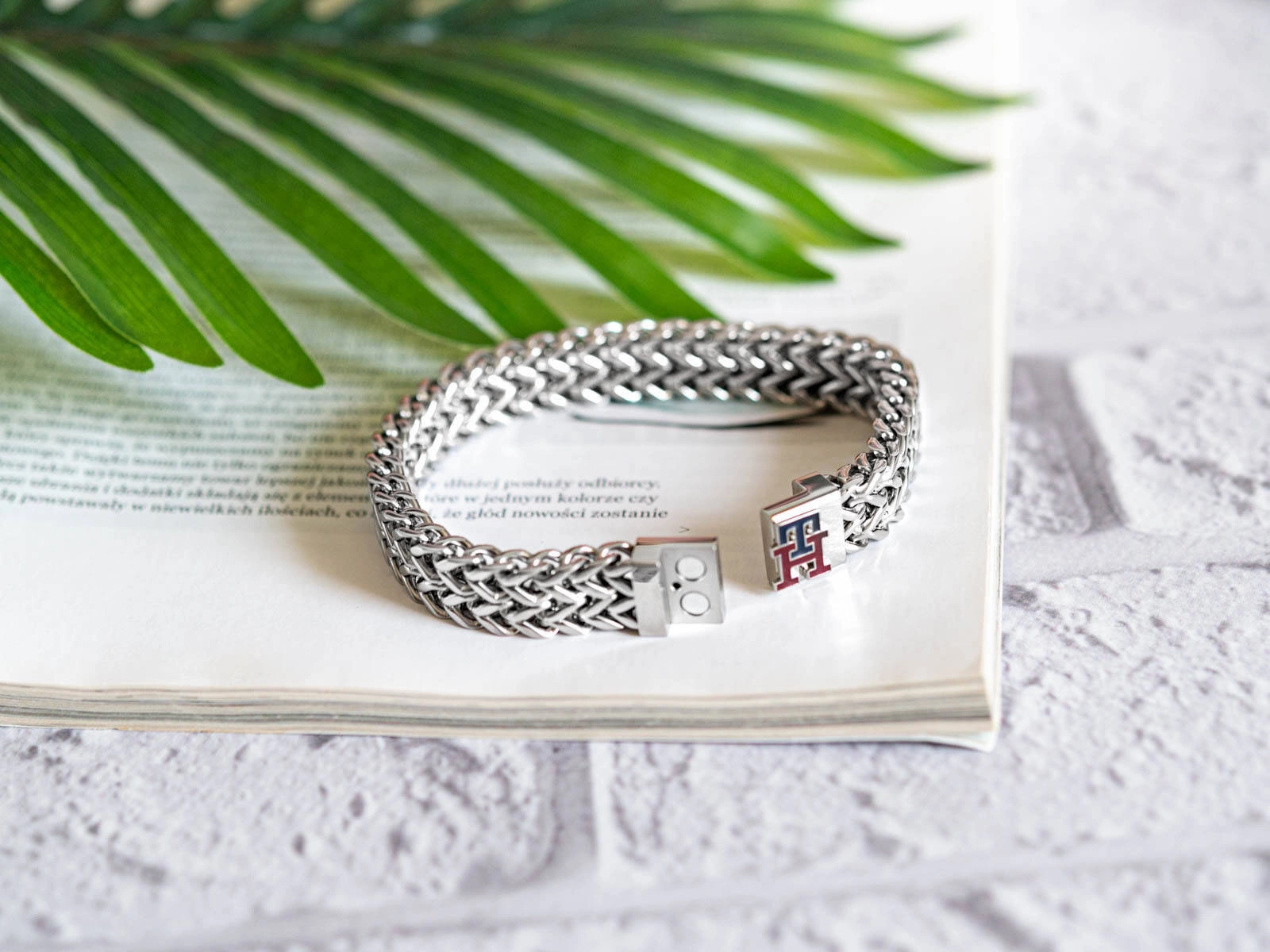 Stalowa bransoleta marki Tommy Hilfiger to elegancki akcent, który ożywi niejeden męski look. To połączenie klasycznej estetyki z nowoczesnością. Wykonana w całości z trwałej stali szlachetnej, niezwykle odpornej na korozję, dzięki czemu będzie cieszyć oko przez długi czas. Fantastycznie komponuje się z zegarkami w kolorze srebrnym na bransolecie. Zapięcie ozdobiono charakterystycznym niebiesko-czerwonym logo, które niewątpliwie przyciąga uwagę. Biżuteria będzie pasować na nadgarstek o obwodzie do 18,5cm. Produkty marki Tommy Hilfiger są pakowane w oryginalne opakowania, które dodają wartości jako prezent lub przechowywanie.