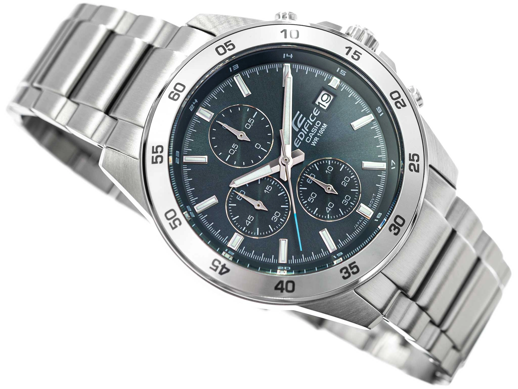 Casio EFR-526D-2AVUEF, to niezwykle świeża propozycja dla miłośników serii EDIFICE. Srebrna stal idealnie komponuje się z metaliczną, niebieską tarczą. Wyraźnie oznaczone małe tarcze stopera, obsługuje się za pomocą przycisków umieszczonych z boku koperty. Jest to funkcja przydatna dla osób aktywnych, uprawiających sport. Przy godzinie 3 producent zamieścił datownik wskazujący aktualny dzień miesiąca. Klasa wodoszczelności na poziomie 100m pozwala na bezproblemowy kontakt z wodą, bez obaw o zalanie. Casio Edifice EFR-526D-2A wspaniale prezentuje się na męskim nadgarstku i z powodzeniem może zostać uzupełnieniem biurowej lub codziennej stylizacji.