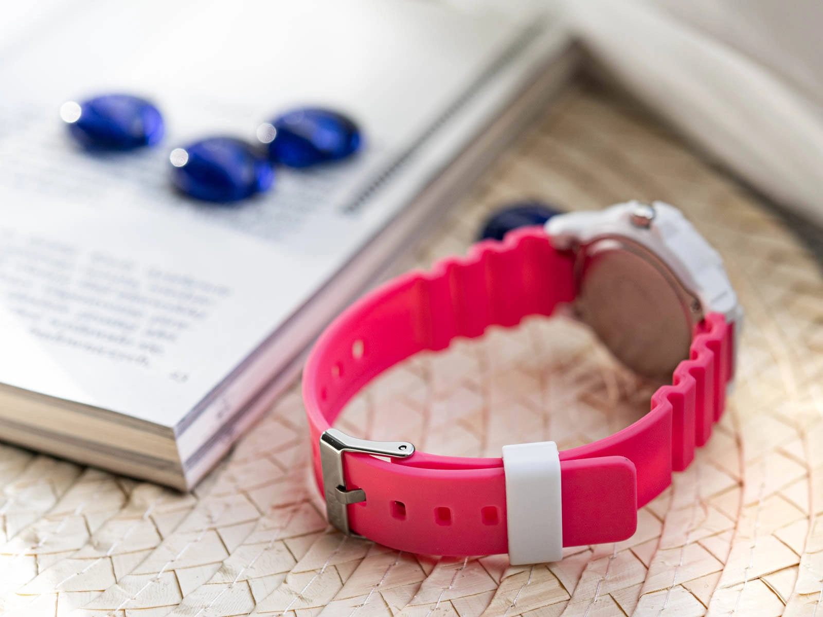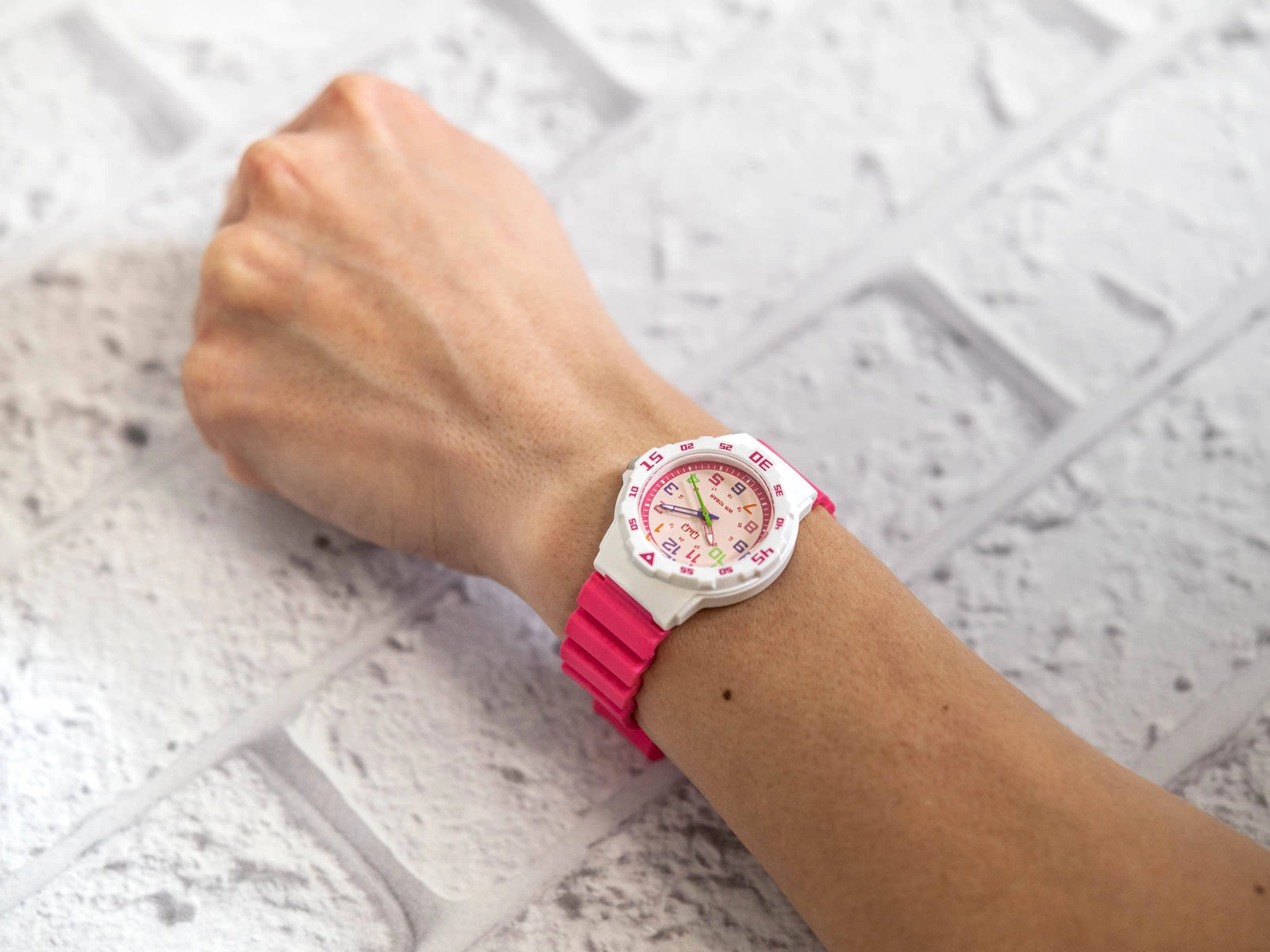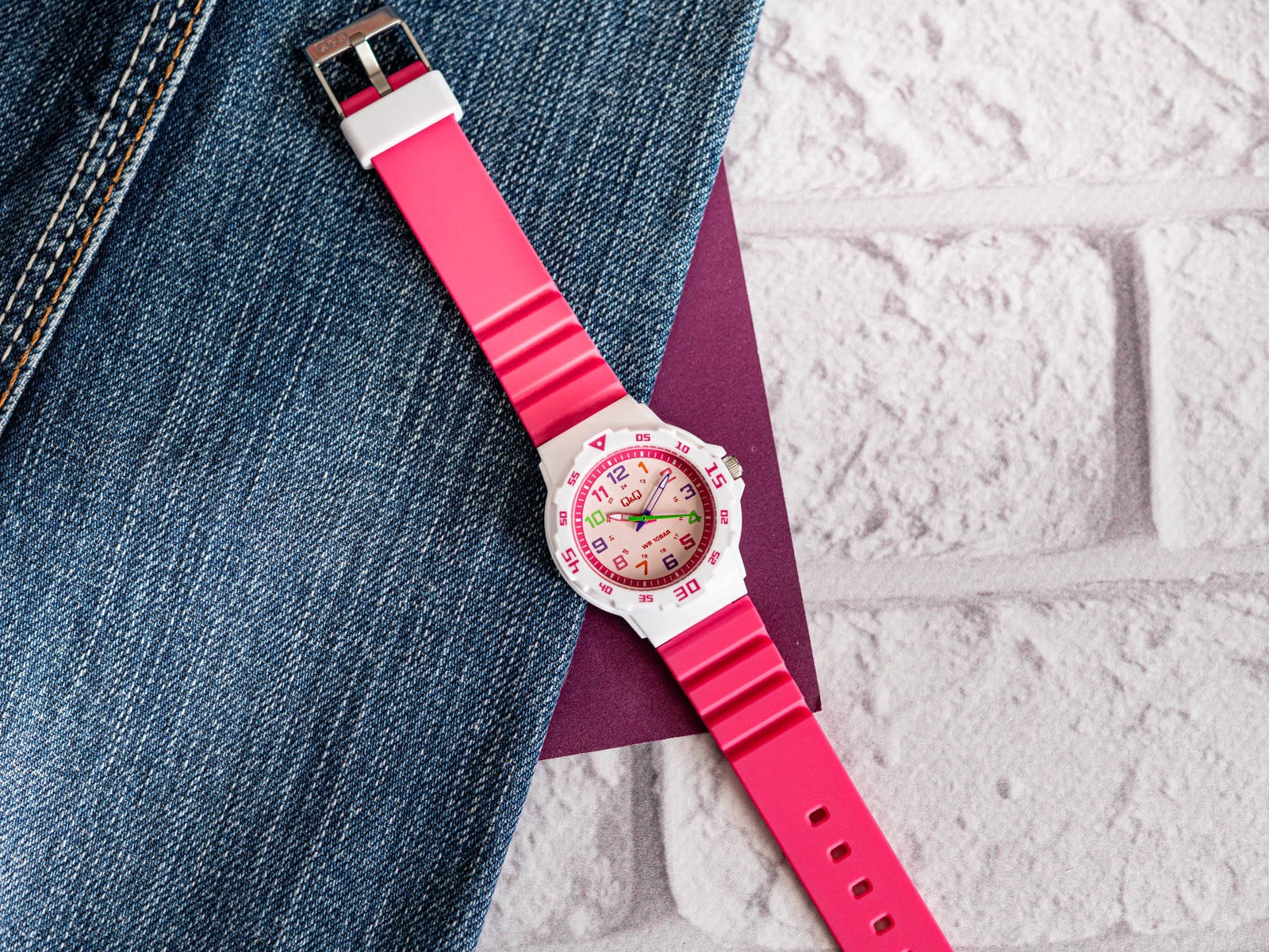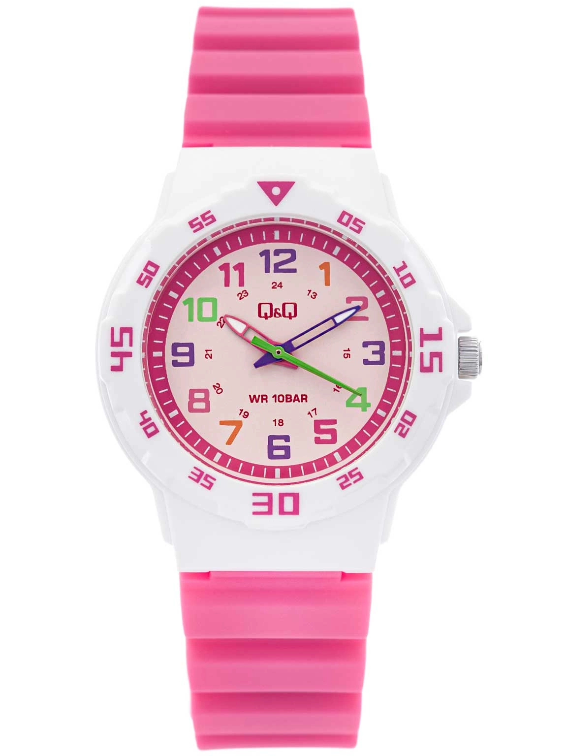Zegarek dla dziewczynki Q&Q VR19J012Y pomoże w rozpoczęciu przygody z czasem! Na jasnoróżowym cyferblacie godziny oznaczone są za pomocą kolorowych, wyraźnych cyfr arabskich. Końcówki wskazówki godzinowej i minutowej pokryte są farbą fluorescencyjną, po naświetleniu świecą w ciemności przez jakiś czas. Wygodny pasek z tworzywa sztucznego będzie pasował na nadgarstek o obwodzie od 14.5cm do 21cm. Klasa wodoszczelności 10BAR pozwala na swobodne pływanie z zegarkiem na ręku. Model ten świetnie sprawdzi się w codziennym użytkowaniu i ze względu na niezwykle dziewczęcą, różową kolorystykę, spodoba się nawet najmłodszej użytkowniczce.