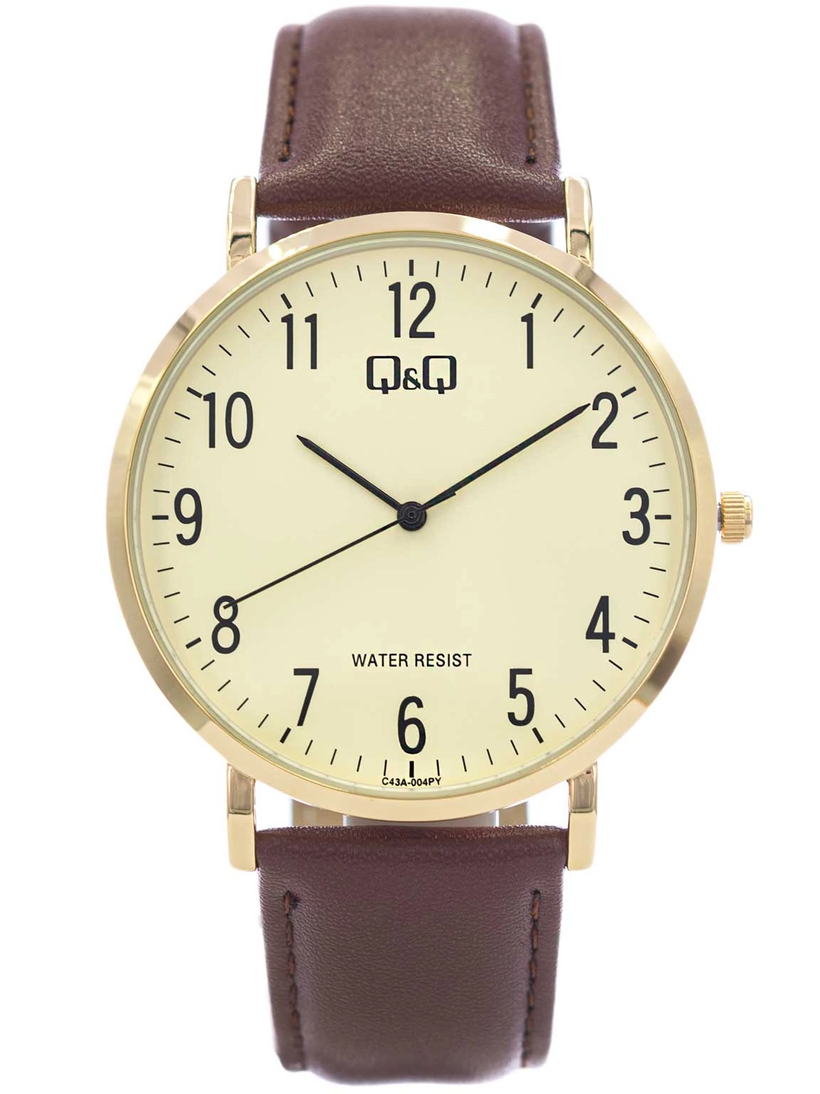 Q&Q C43A-004PY to klasyczny męski zegarek, w bardzo uniwersalnej kolorystyce. Złota, błyszcząca metalowa koperta, została zawieszona na gładkim, brązowym pasku. Na beżowym cyferblacie godziny wyznaczone są za pomocą wyraźnych cyfr arabskich. Q&Q C43A-004PY będzie idealną propozycją do codziennego użytku. Świetnie skomponuje się ze strojem codziennym, jak i tym bardziej formalnym. Ze względu na swoją smukłość, model ten bez problemu schowa się pod rękawem koszuli.