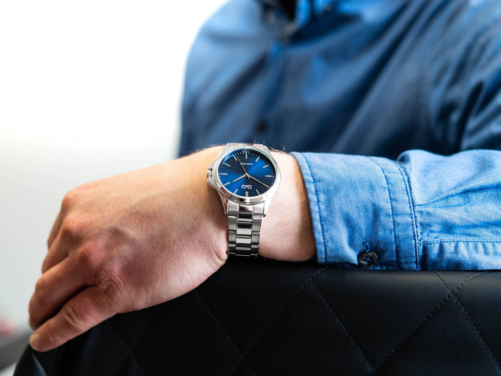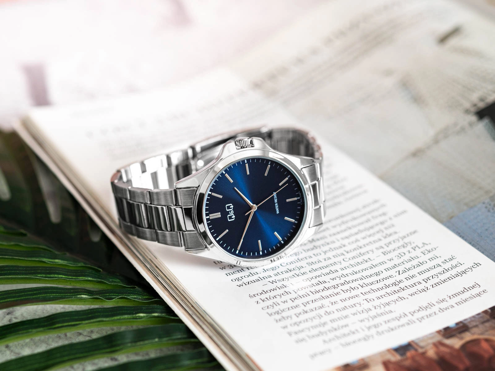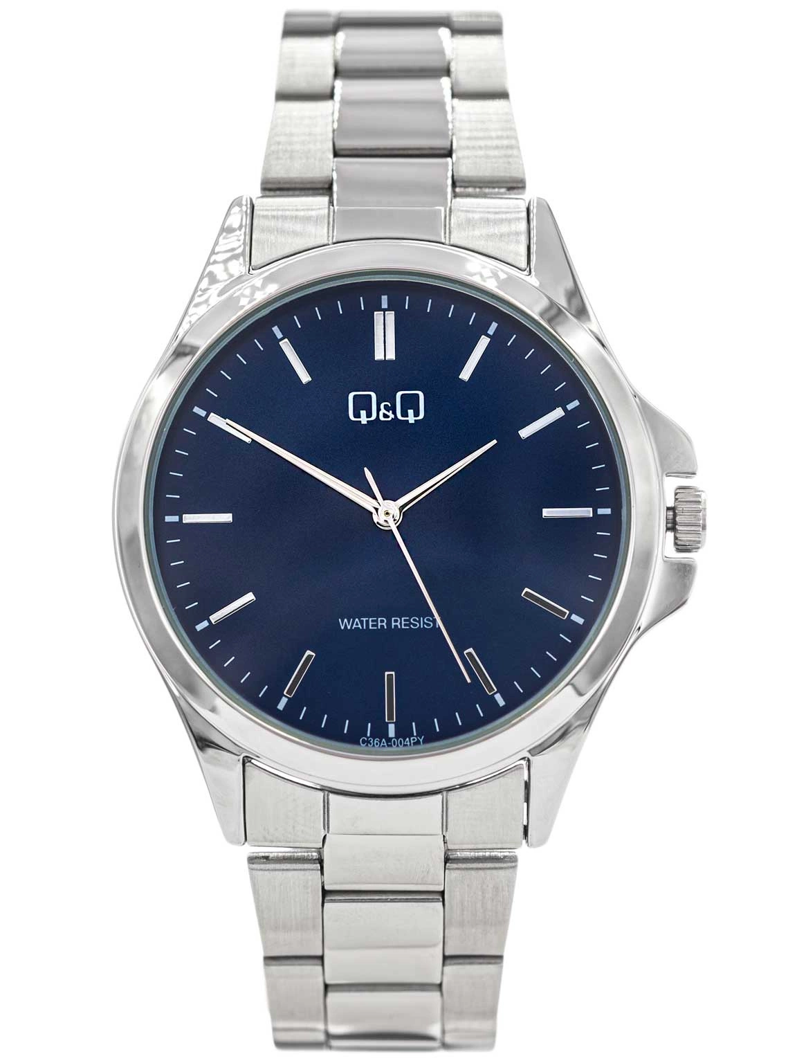 Q&Q C36A-004PY to doskonała propozycją dla panów, którzy poszukują czasomierza na co dzień. Na granatowym, błyszczącym cyferblacie, godziny wyznaczone są za pomocą pionowych indeksów. Aktualny czas ustawia się za pomocą pokrętła, umieszczonego z prawej strony koperty. Srebrna bransoleta o obwodzie do 20,5 cm jest skracalna, tak więc bez problemu można ją dopasować indywidualnie do swojego nadgarstka. Klasyczne zestawienie kolorów, minimalizm i prostota, idealnie wkomponują się, jako dodatek do każdej stylizacji.