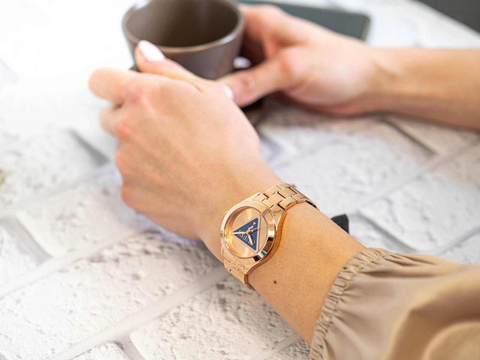 GUESS Tri Plaque GW0675L3 zaprojektowany został z myślą o nowoczesnej kobiecie. Model ten wyróżnia się błyszczącym wykończeniem w odcieniu różowego złota z dodatkiem granatowego. Dzięki niezawodnemu japońskiemu mechanizmowi kwarcowemu czasomierz zapewnia dokładność i pewność działania. Z racji, że jest wykonany ze stali szlachetnej, jest nie tylko wytrzymały, ale również odporny na korozję. Cyferblat ozdobiony jest wyrazistym i kultowym logo GUESS, które bez wątpienia przyciąga wzrok. Smukła bransoleta z zapięciem motylkowym idealnie układa się na nadgarstku, oferując komfort noszenia przez cały dzień. GUESS GW0675L3 doskonale komponuje się z różnorodnymi stylizacjami, od codziennych po wieczorowe.