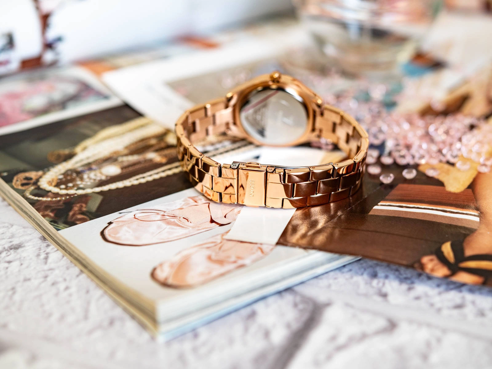 - Zegarek Damski Guess GW0675L3 czerwone złoto na bransolecie.