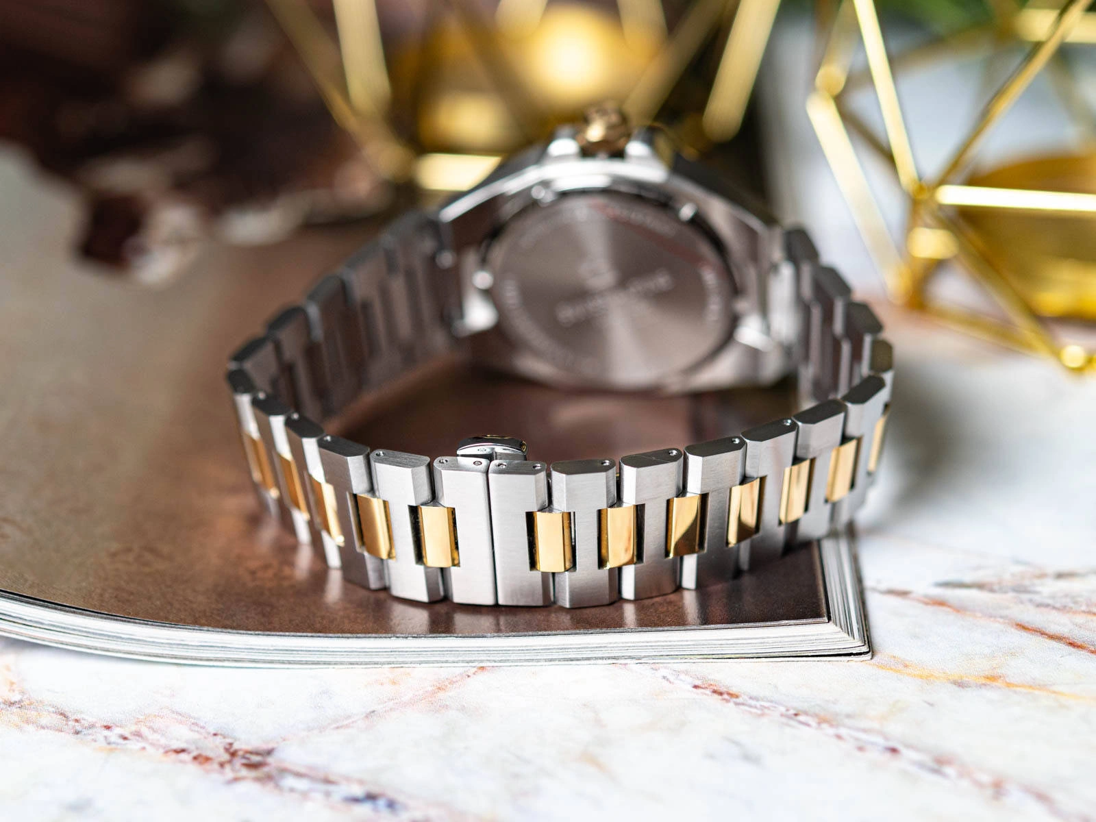 - Wodoszczelny Zegarek Męski Swiss Alpine Military SAM7005.1144 srebrno-złoty na bransolecie, posiada funkcję datownika.