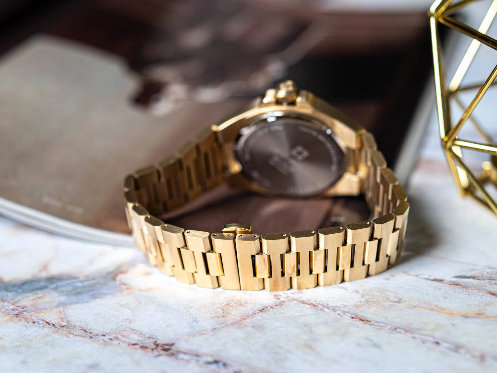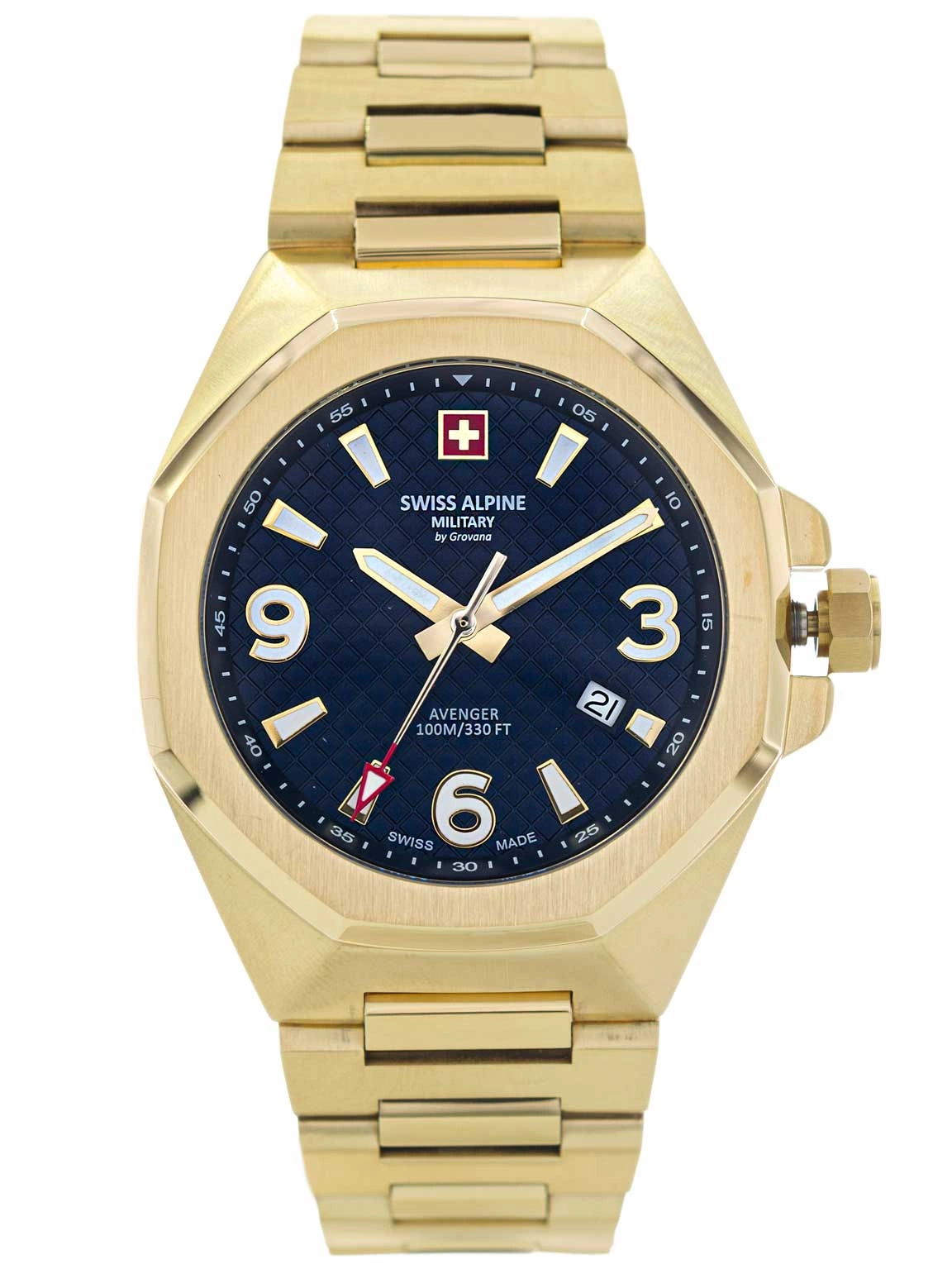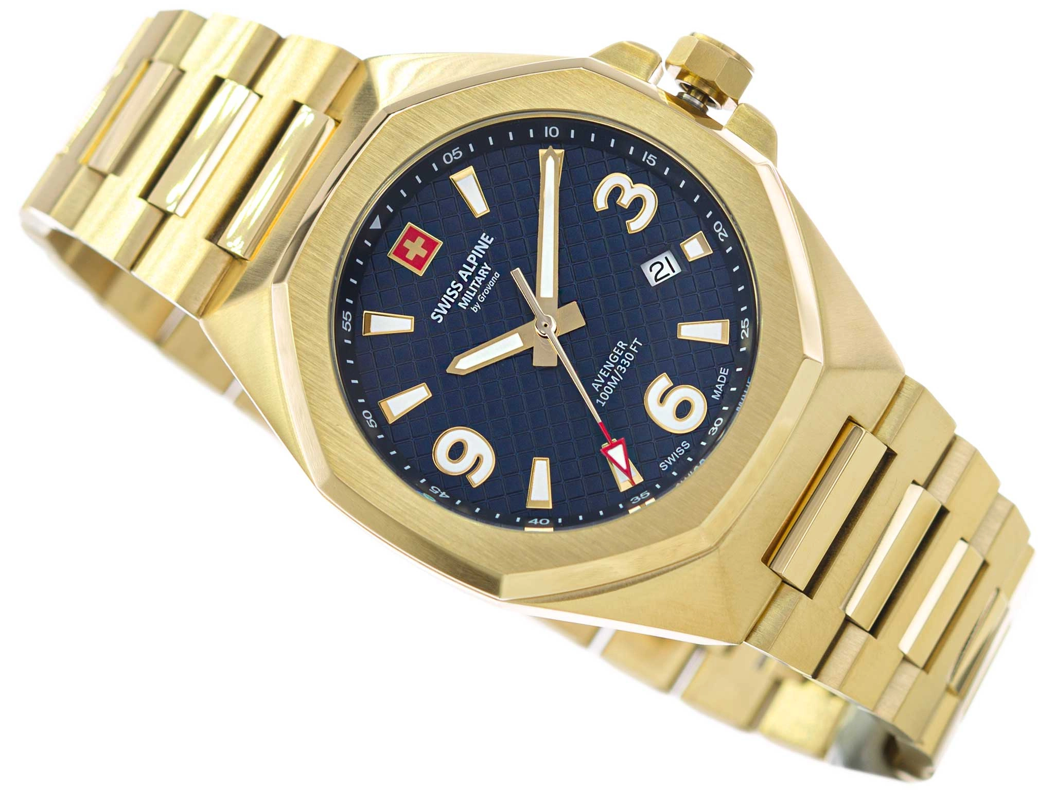 - Wodoszczelny Zegarek Męski Swiss Alpine Military SAM7005.1115 złoty na bransolecie, posiada funkcję datownika.