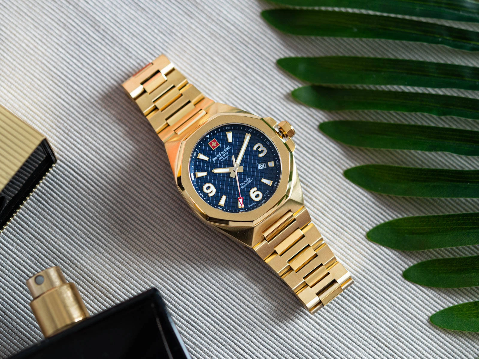 Swiss Alpine Military SAM7005.1115 to cechujący się precyzją i nowoczesnym podejściem do designu model. Jest napędzany zasilanym baterią mechanizmem kwarcowym wyprodukowanym w Szwajcarii. Solidna koperta z oktagonalnym bezelem jest wykonana z wysokiej jakości stali szlachetnej i umieszczona na wygodnej złotej bransolecie, która wzbogaci każdą stylizację. Na granatowej tarczy przy indeksie wskazującym godzinę 4 można znaleźć datownik, pokazujący aktualny dzień miesiąca. Odczyt godziny nawet w nocy lub złych warunkach znacząco ułatwiają wskazówki i indeksy z funkcją neobrite, które po naświetleniu będą świecić przez jakiś czas. Klasa wodoszczelności 10ATM pozwala na pływanie z zegarkiem na ręce. Nowoczesna stylistyka i użycie wysokiej klasy komponentów sprawi, że produkt spełni oczekiwania każdego mężczyzny doceniającego funkcjonalny i stylowy dodatek. Do tego modelu dołączone jest oryginalne pudełko producenta, może posłużyć jako opakowanie na prezent.