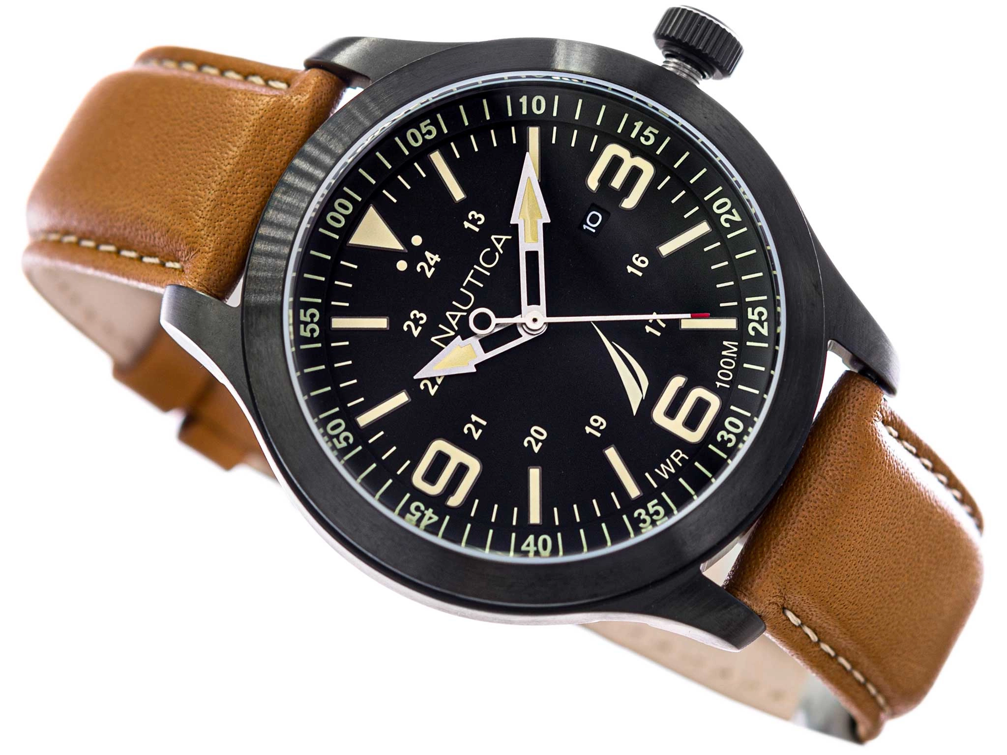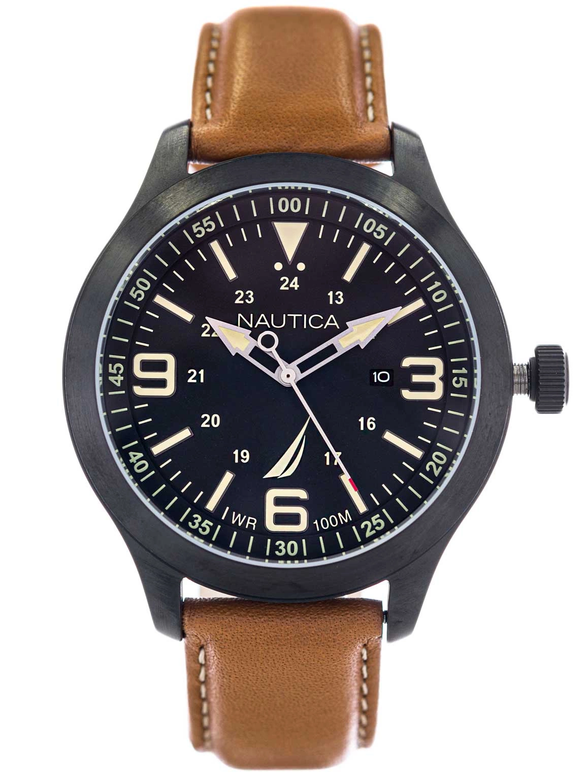 • Wodoszczelny Zegarek Męski Nautica NAPPLS017 brązowy na pasku, posiada funkcję datownika.
