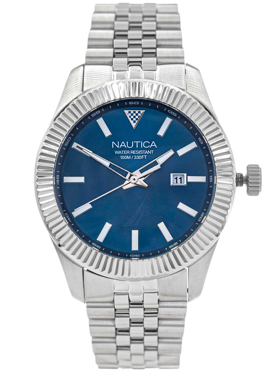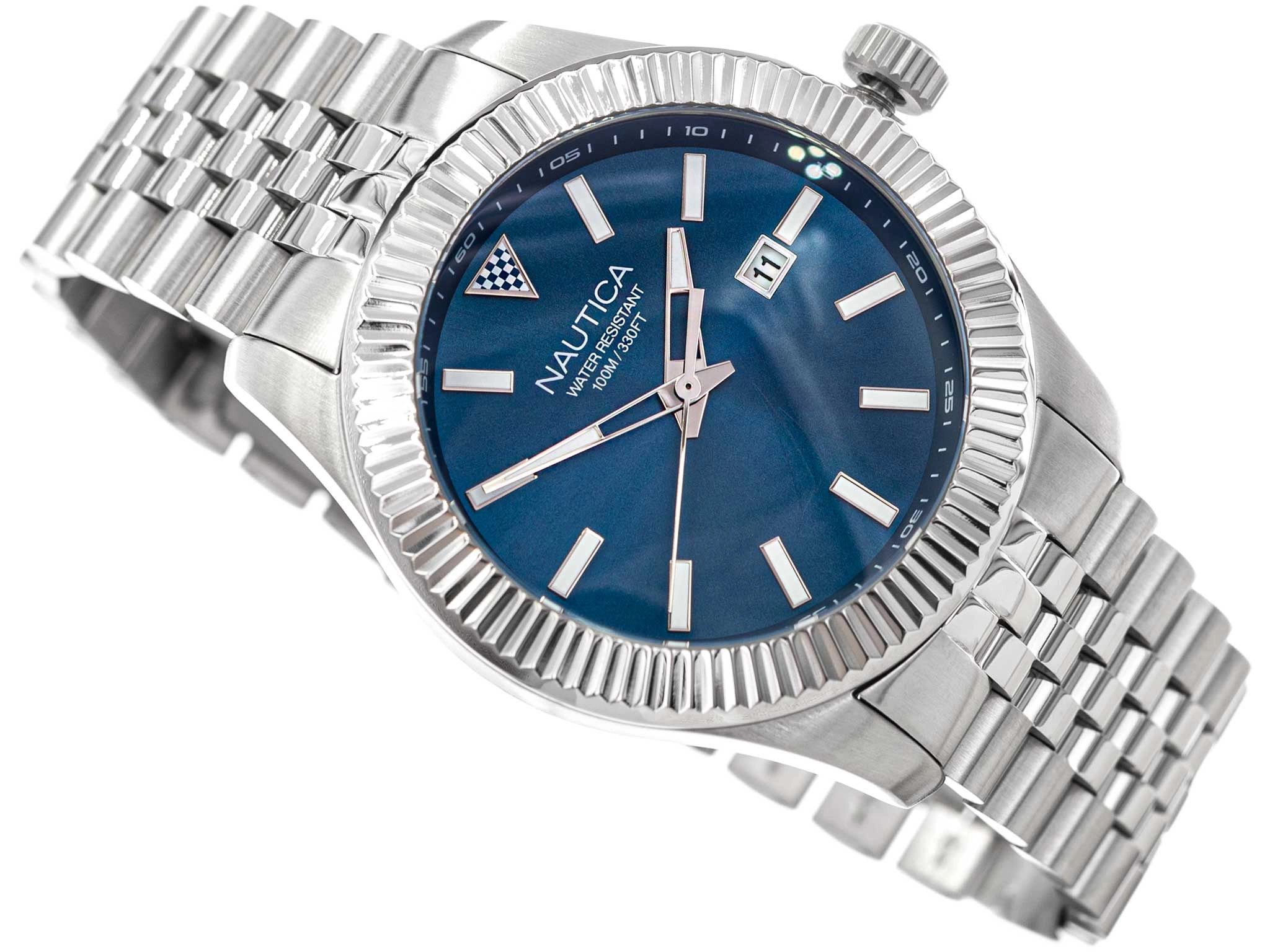 - Wodoszczelny Zegarek Męski Nautica NAPPBS248 srebrny na bransolecie z funkcją neobrite i datownikiem.