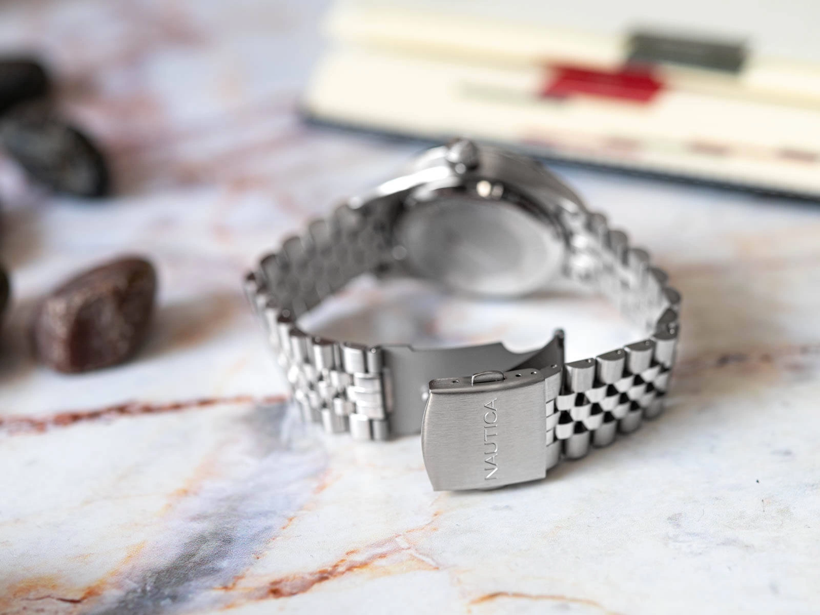 Nautica PACIFIC BEACH NAPPBS248 jest modelem w klasycznej kolorystce, który sprawdzi się w eleganckiej i casualowej stylizacji. Srebrna koperta zawieszona została na bransolecie wykonanej z wysokiej jakości stali szlachetnej. Stop ten charakteryzuje się wysoką odpornością na korozję co w połączeniu z klasą wodoszczelności 100M, umożliwia pływanie z zegarkiem na ręku. Należy pamiętać o tym, że koronka musi być zakręcona do końca, by woda nie dostała się do wnętrza. Odczyt godziny w złych warunkach oświetleniowych ułatwiają wyposażone w fosforyzujące elementy neobrite wskazówki i indeksy, które po naświetleniu będą świecić przez jakiś czas. Nawiązaniem do żeglarskich tradycji jest morska flaga sygnałowa November umieszczona na pozycji godziny 12. Tuż obok indeksu godziny 3 znajduje się okienko datownika, wskazujące dzień miesiąca. Zegarek zapakowany jest w oryginalne pudełko, które doskonale sprawdzi się jako opakowanie na prezent.