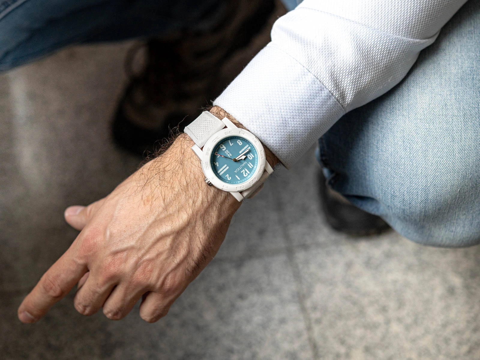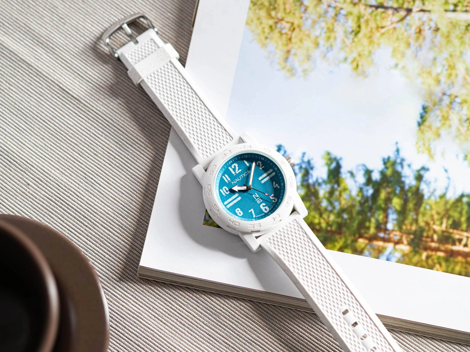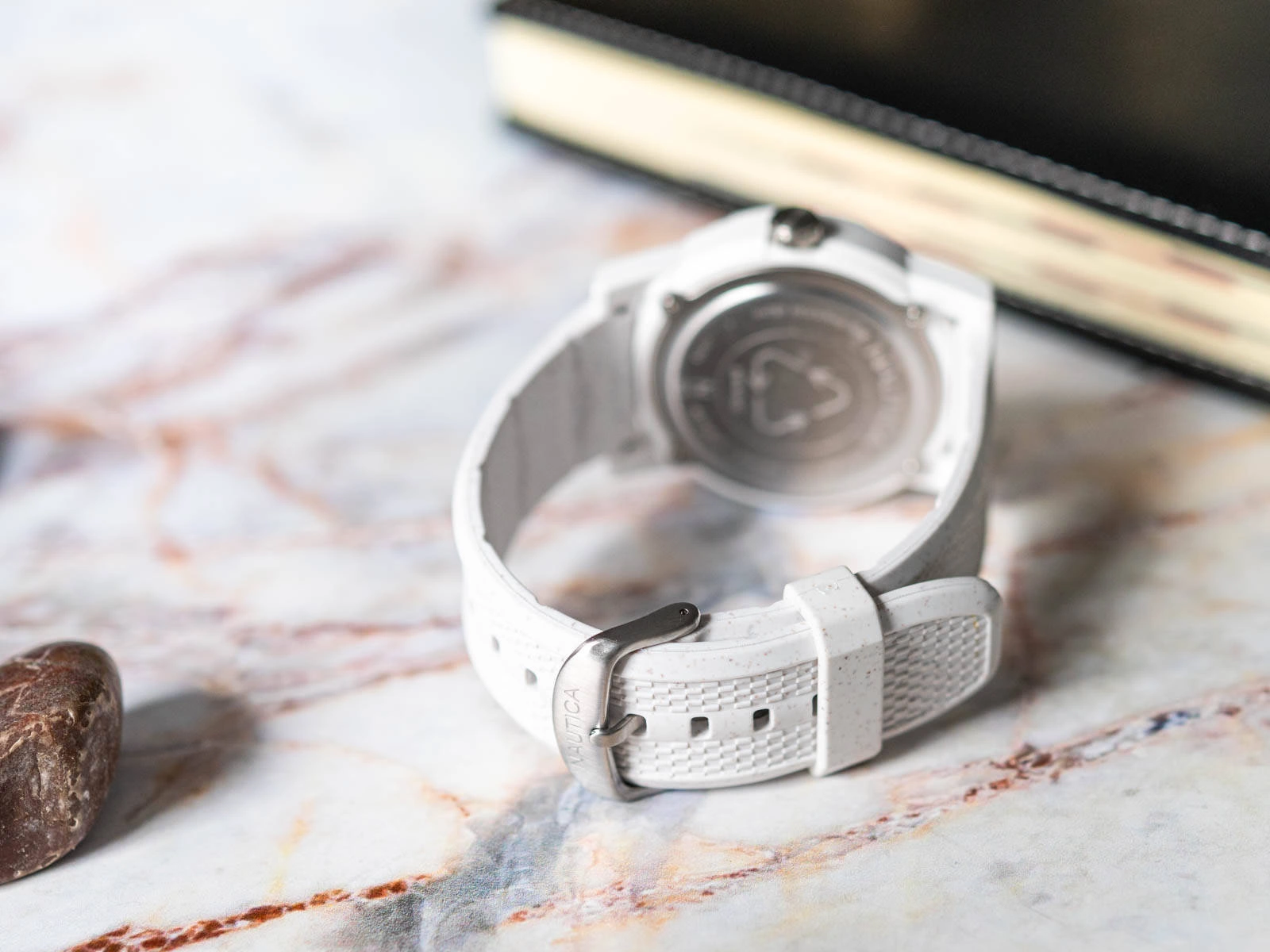 Nautica NAPATS302 M83 Aiya Triada to zegarek będący połączeniem innowacyjnych ekologicznych rozwiązań materiałowych, niezawodnego japońskiego mechanizmu kwarcowego oraz niebanalnej stylistyki. Zasilany baterią mechanizm zamknięto w kopercie będącej kombinacją ceramiki i ekologicznego tworzywa sztucznego. Zastosowane w pasku tworzywo sztuczne, wzbogacone jest w włókno PU z pszenicy, to zrównoważony materiał tekstylny, który łączy białka pszenicy z poliuretanem, tworząc biodegradowalne i wytrzymałe włókno. Jest to innowacyjna alternatywa dla tradycyjnych włókien syntetycznych, oferująca miękkość, elastyczność i mniejszy wpływ na środowisko. Niebieską tarczę z czytelnymi białymi cyframi chroni płaskie szkiełko mineralne. Klasa wodoszczelności 50M, oznacza, że zegarek jest odporny na deszcz i przypadkowe zachlapanie. Odczytanie godziny nawet w kiepskich warunkach oświetleniowych ułatwiają wskazówki wyposażone w fosforyzujące elementy Neobrite, które po naświetleniu będą świecić przez jakiś czas. Nautica NAPATS302 M83 Aiya Triada będzie doskonałym wyborem dla mężczyzn szukających funkcjonalnego dodatku do codziennej stylizacji.