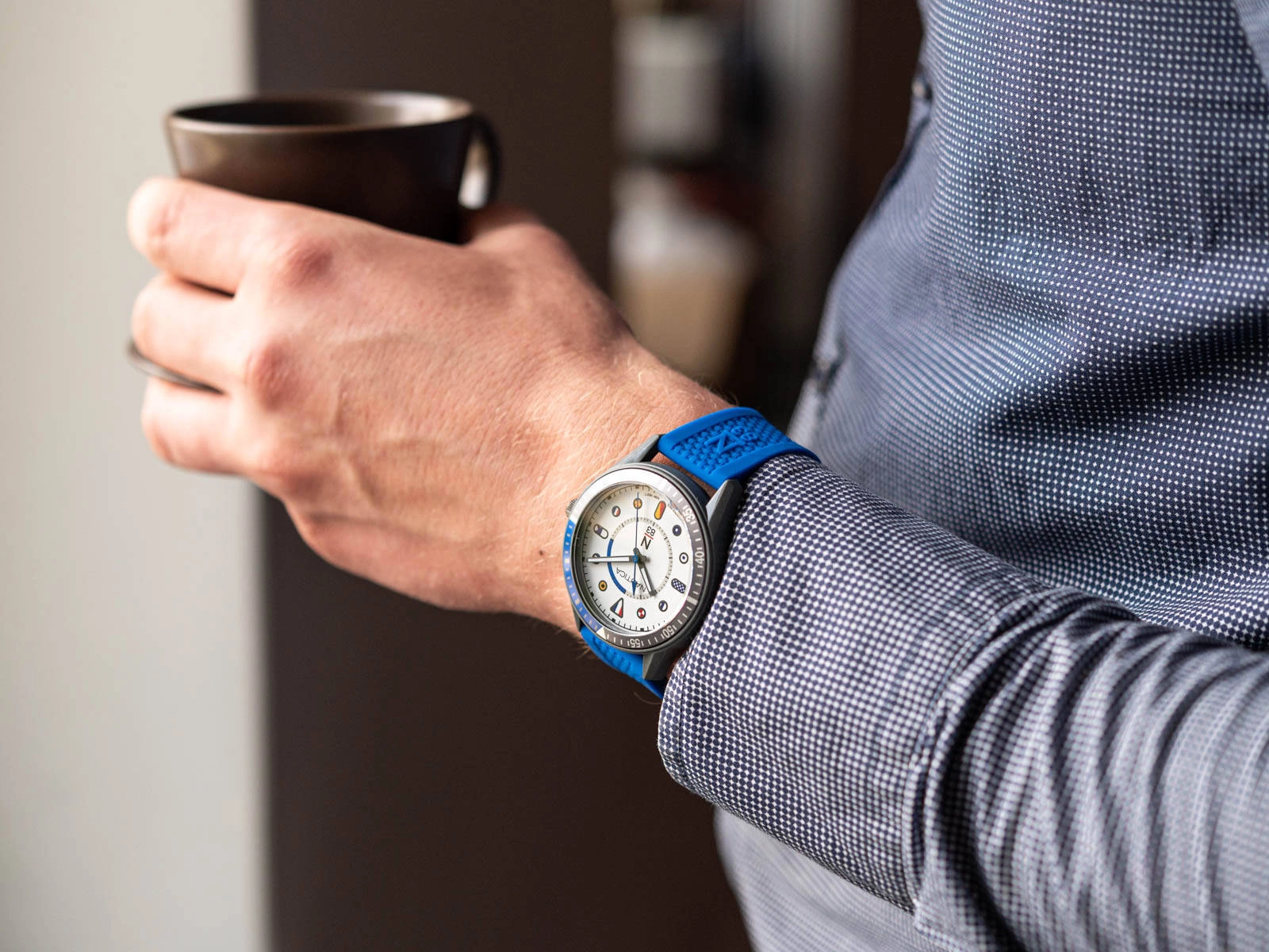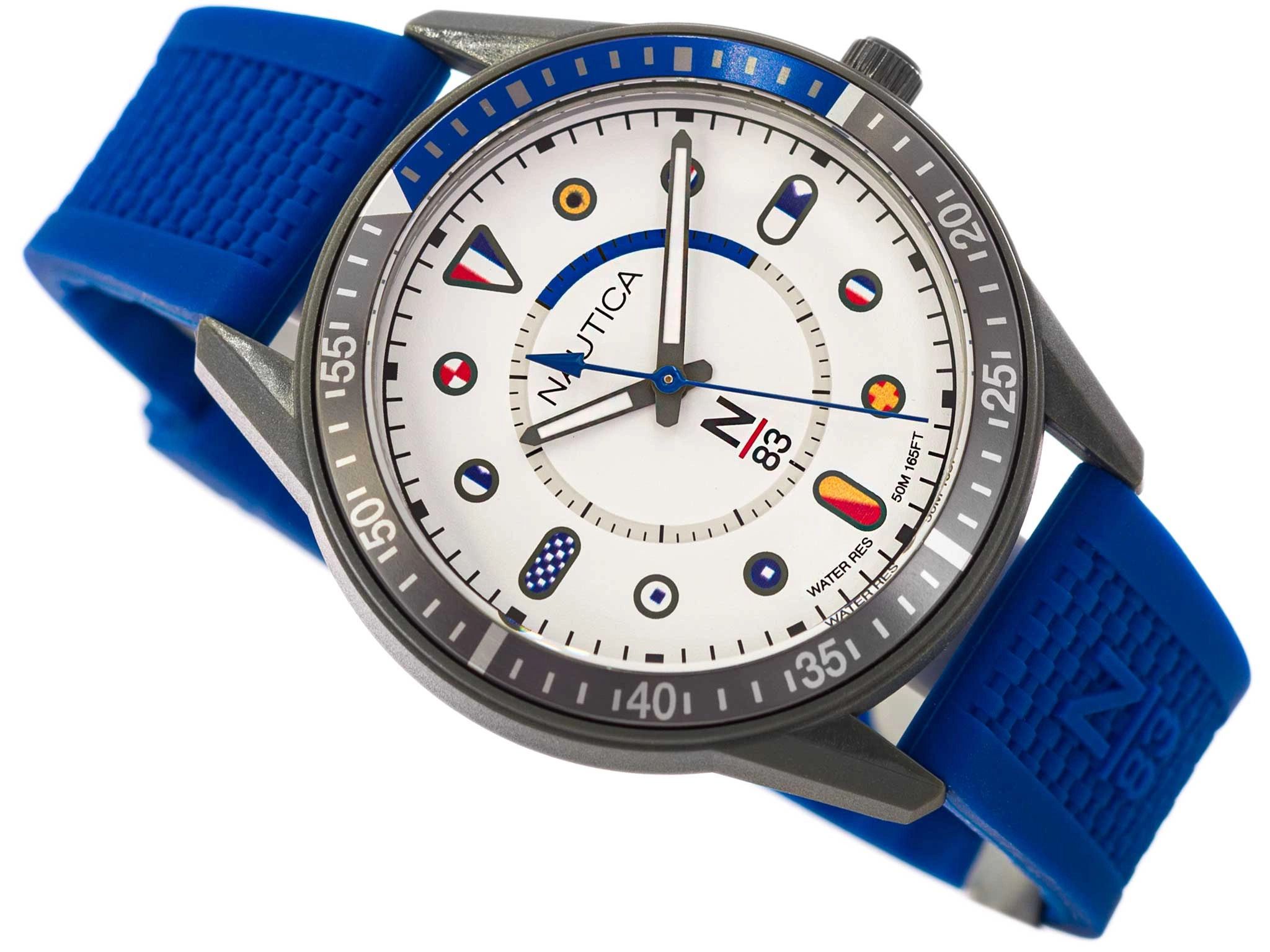 Nautica N83 Surf Park NAPSPS903 to model o żeglarskim designie, który sprawdzi się zarówno w aktywnościach sportowych jak i codziennych stylizacjach. Ciemnoszara koperta została wykonana z lekkiego tworzywa sztucznego, zawieszona na wygodnym niebieskim silikonowym pasku, który świetnie dostosowuje się do nadgarstka. Klasa wodoszczelności 50M oznacza, że zegarek jest odporny na deszcz i zachlapania. Odczytanie godziny nawet w kiepskich warunkach oświetleniowych ułatwiają wskazówki wyposażone w fosforyzujące elementy neobrite, które po naświetleniu będą świecić przez jakiś czas. Na białej tarczy obok indeksów oznaczających godziny umieszczono grafiki międzynarodowych sygnałów morskich, co z pewnością przemówi do każdego żeglarza lub marynisty. Model ten zapakowany jest w oryginalne pudełko, więc jest gotowy do podarowania na prezent.