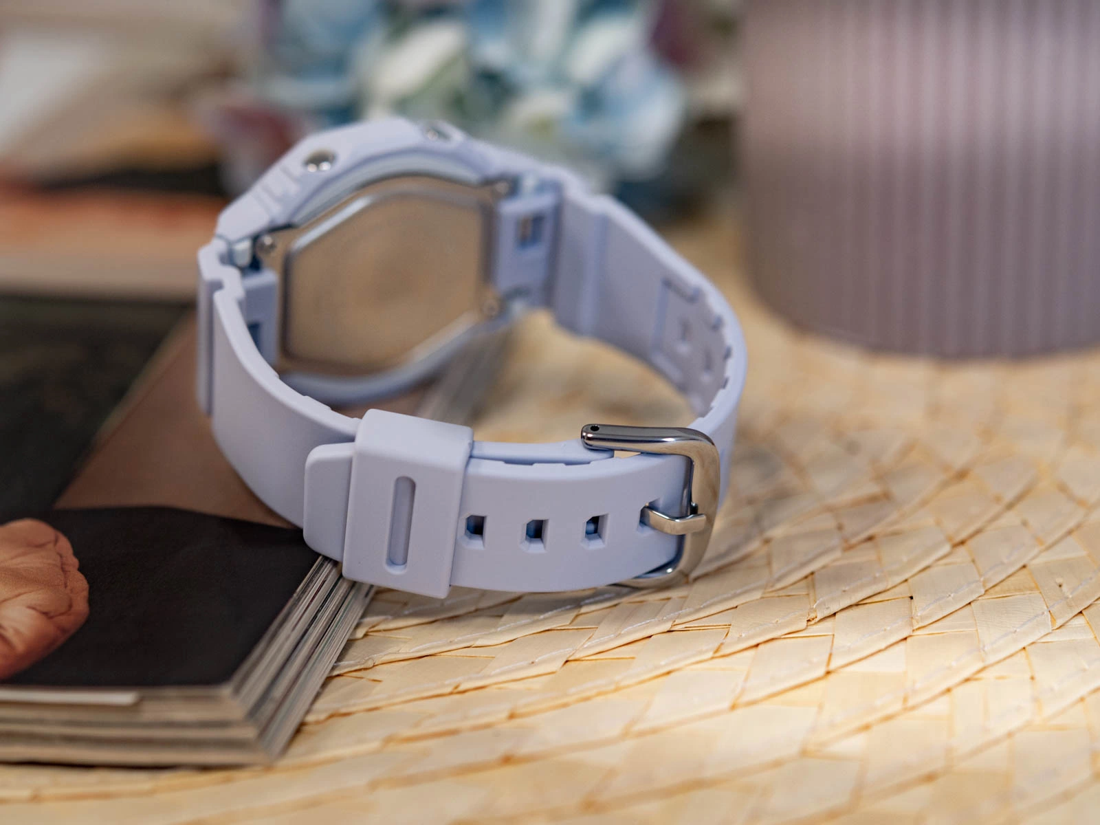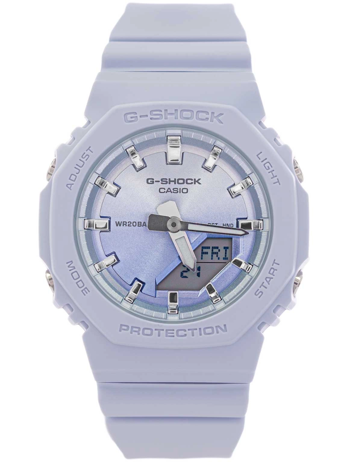 CASIO G-SHOCK GMA-P2100SG-2A Soak Up The Shimmer to zegarek, który zachwyca swoim niepowtarzalnym designem inspirowanym letnimi zachodami słońca. Subtelny błękit tarczy, ozdobiony lśniącą gradacją kolorów, odzwierciedla ciepło i spokój wieczornego nieba nad wodą. Przeznaczony dla kobiet, które poszukują eleganckiego, a zarazem sportowego dodatku, idealnego na każdą okazję. Precyzyjny, japoński mechanizm kwarcowy zapewnia dokładność, a kompaktowe rozmiary oraz lekkość zegarka gwarantują wygodę noszenia przez cały dzień. Wykonany z wytrzymałych materiałów, odpornych na wstrząsy, zegarek jest wyposażony w mineralne szkiełko, które dodatkowo chroni tarczę. GMA-P2100SG-2AER oferuje praktyczne funkcje, takie jak timer, stoper, alarm i automatyczny kalendarz, a także podświetlenie i fosforyzujące wskazówki, co sprawia, że jest on funkcjonalnym dodatkiem do każdej stylizacji. Produkt dostarczany jest w eleganckim, oryginalnym opakowaniu, co czyni go idealnym pomysłem na prezent dla bliskiej osoby.
