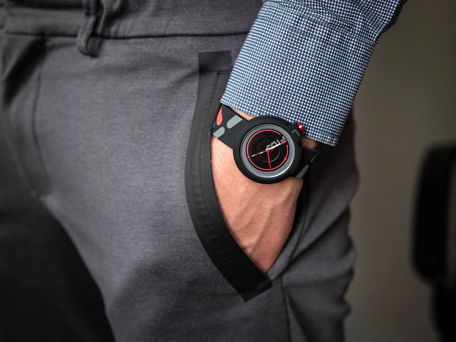 - pasek: czarny z dodatkiem szarego i czerwonego
