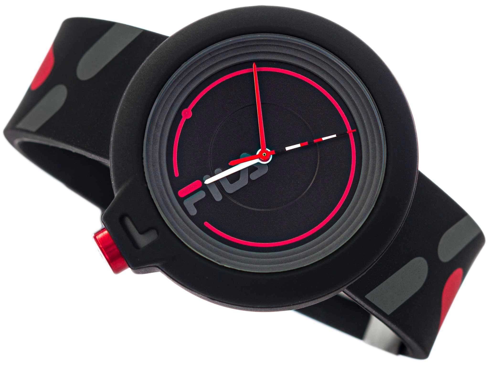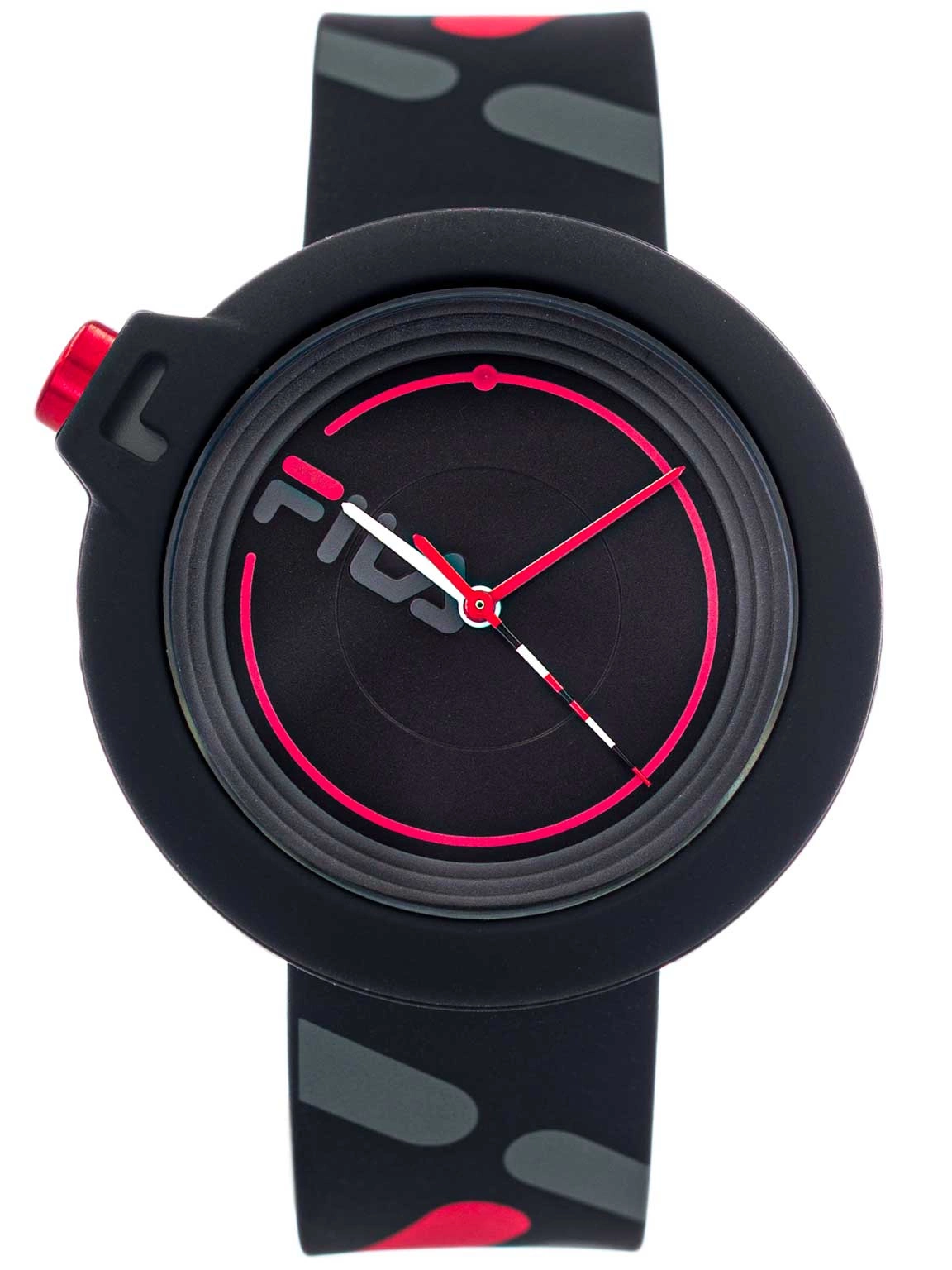 Fila 38-6081-008 to fantastyczny wybór zarówno dla mężczyzny, jak i nastolatka. Zegarek wykonany jest z tworzywa sztucznego, dekielek jest stalowy. Na czarnej kopercie, błyszcząca, wyrazista koronka do ustawiania godziny, została umieszczona nietypowo z lewej strony. Dzięki temu, czasomierz można wygodnie nosić na lewej, ale i na prawej ręce. Gumowy pasek posiada nadruki z logo marki. Uniwersalne połączenie kolorów -czerni, szarego i czerwonego, powoduje że będzie to świetny dodatek do codziennej mniej formalnej stylizacji. Czasomierz świetnie sprawdzi się na prezent dla fana marki FILA, zapakowany jest w oryginalne opakowanie.