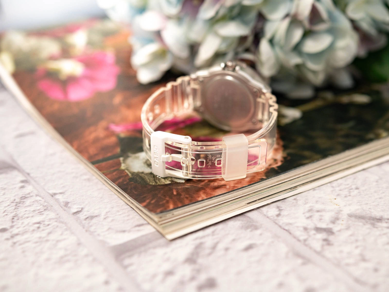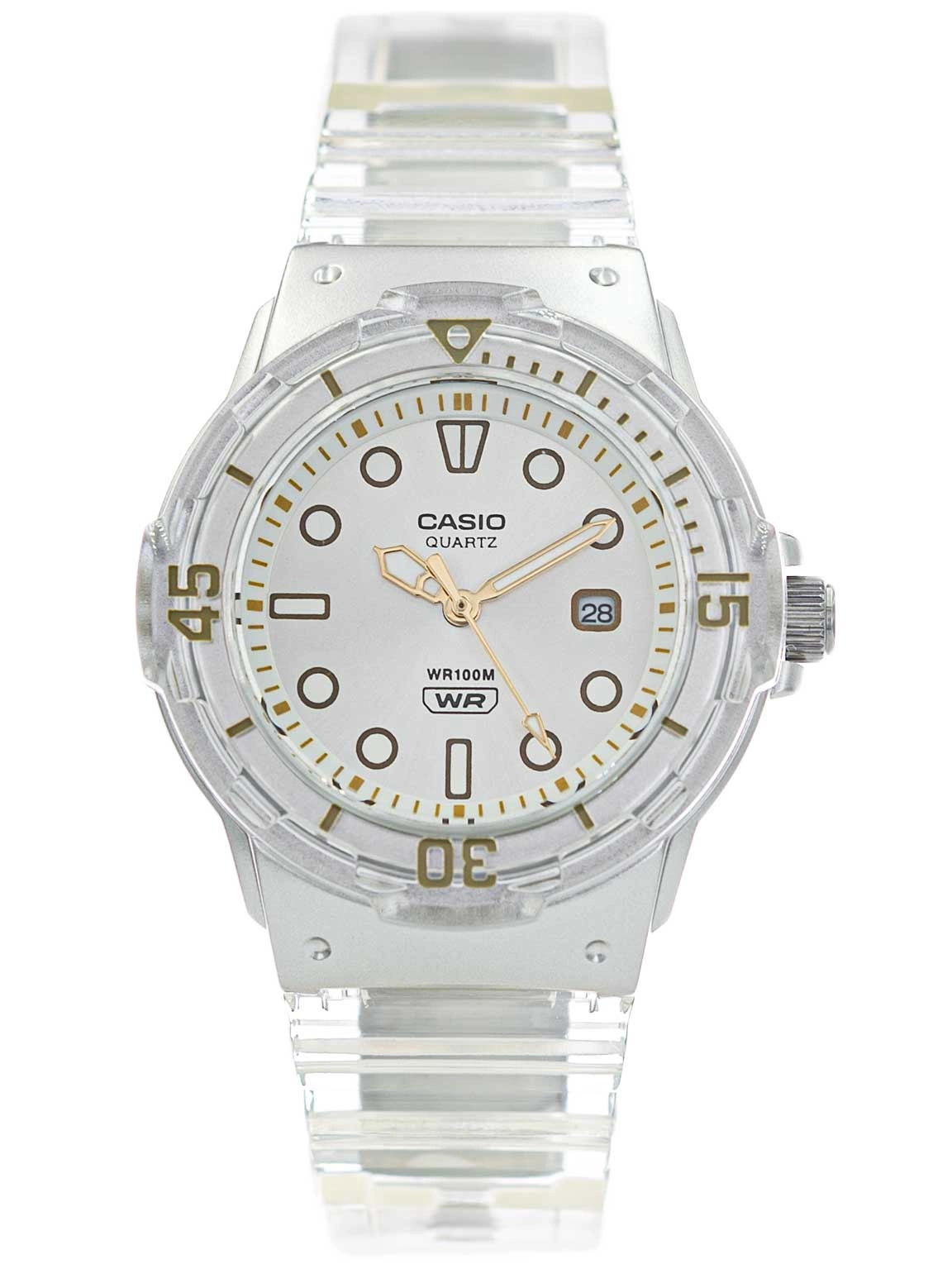 - Wodoszczelny Zegarek Damski Casio LRW-200HS 7 transparentny na pasku, posiada funkcję datownika.