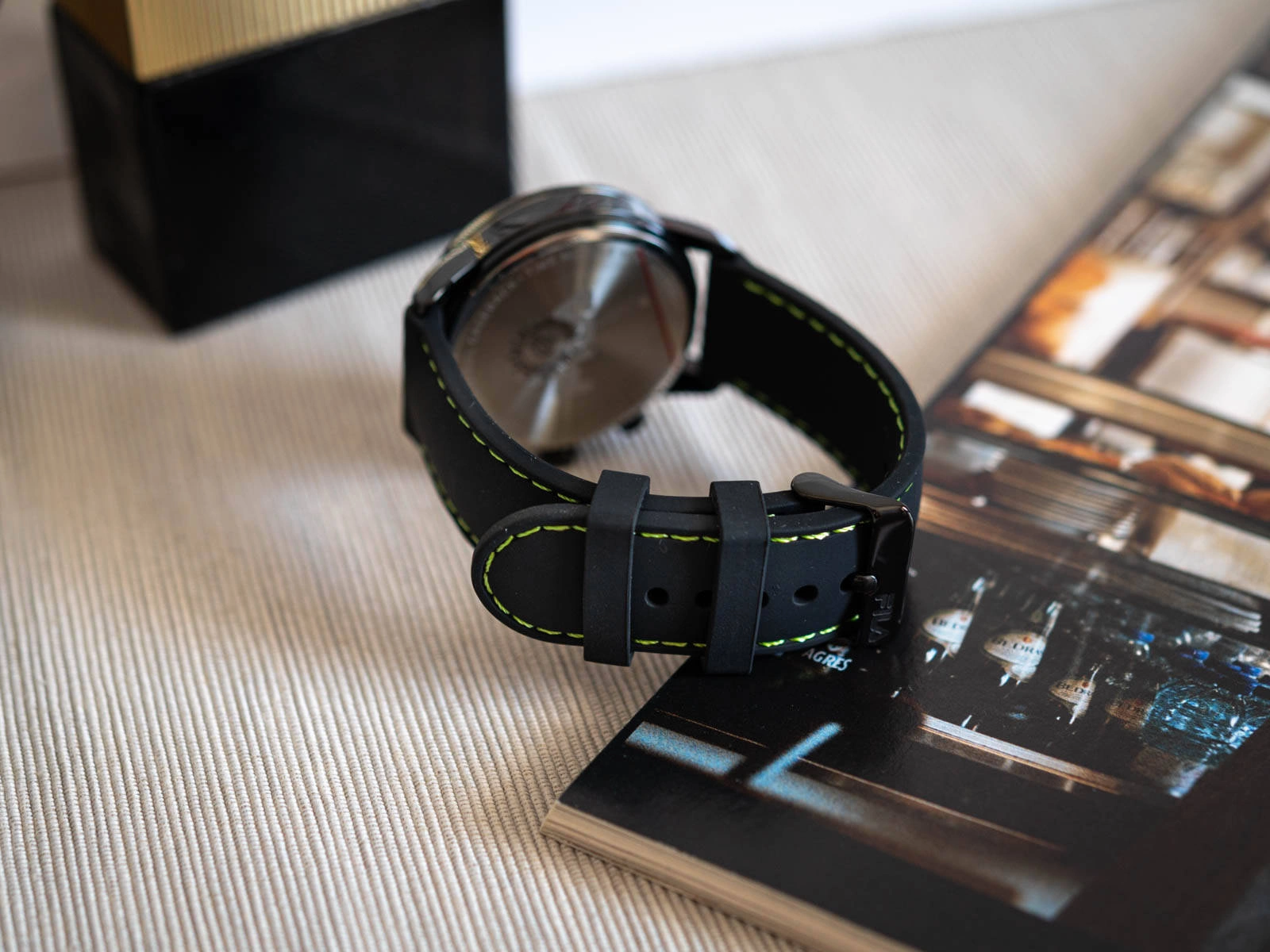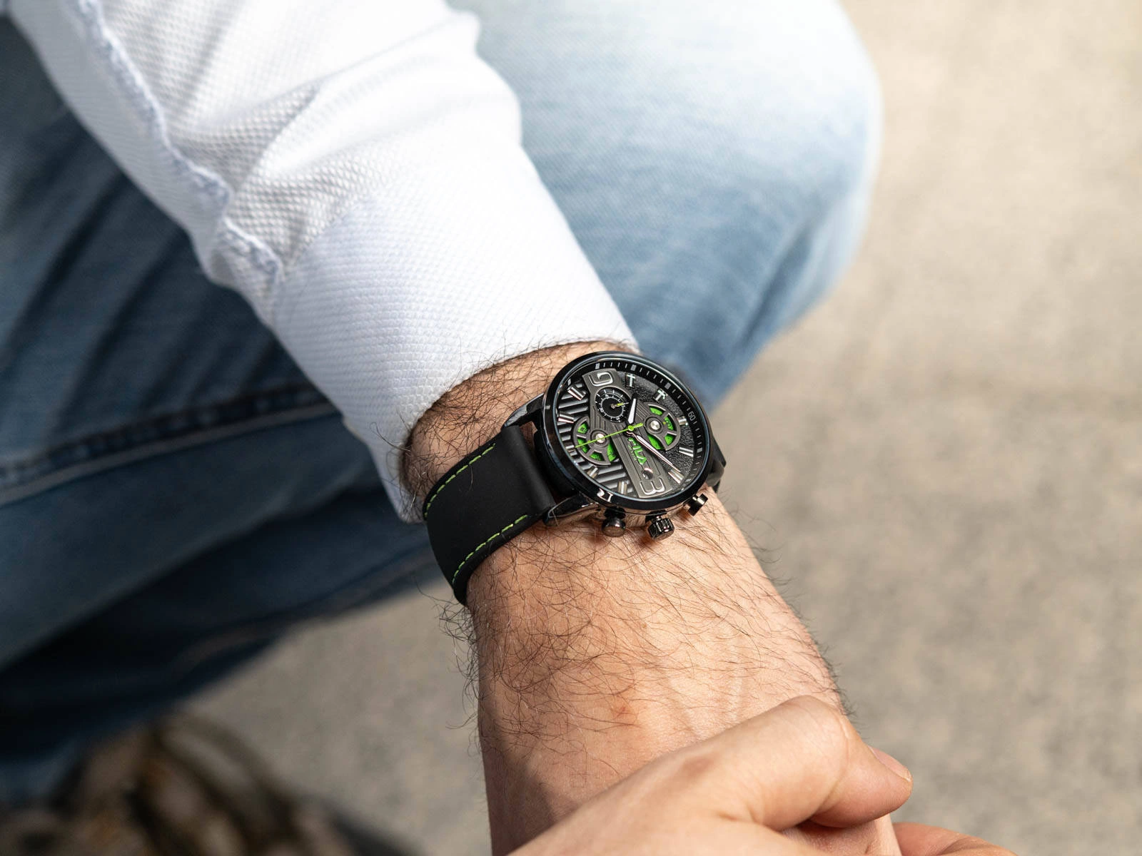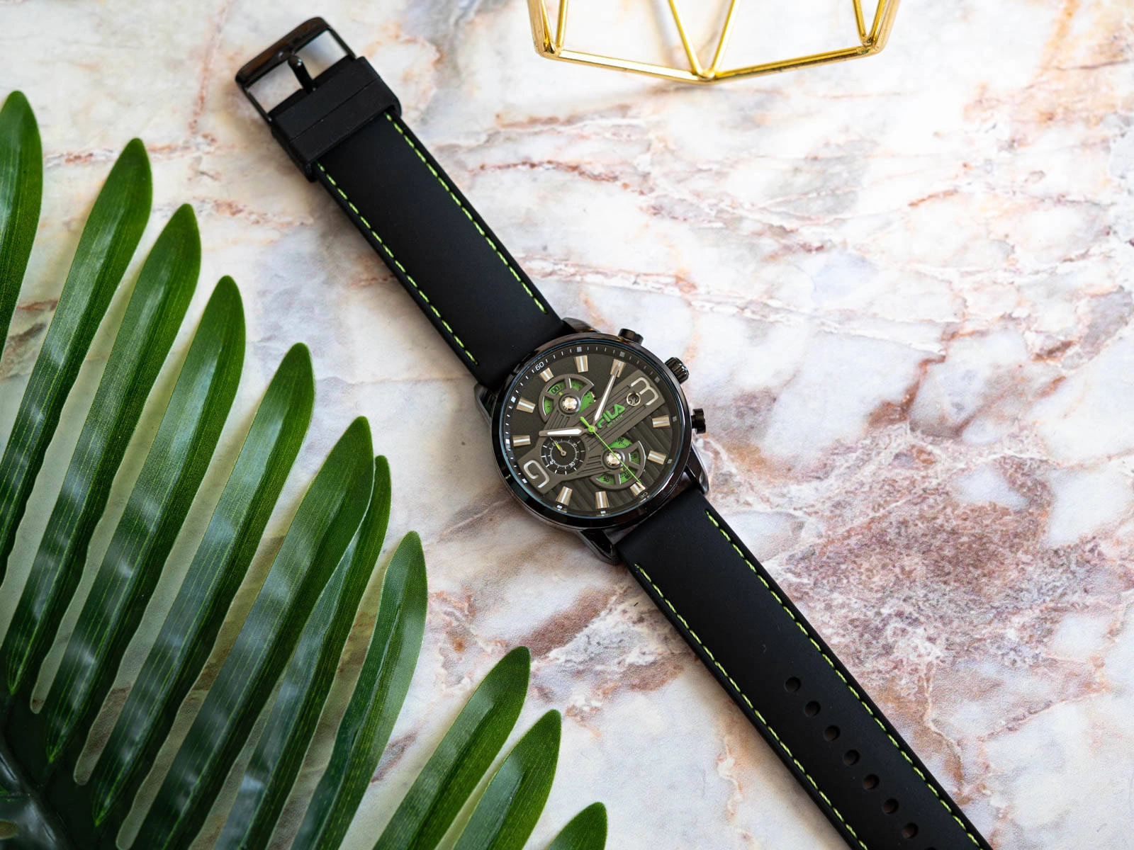 Model Fila 38-175-002 to doskonałe połączenie nowoczesnego, sportowego stylu i funkcjonalności. Zegarek napędza zasilany baterią mechanizm kwarcowy, zamknięty pod zakręcanym dekielkiem ze stali szlachetnej. Metalowa koperta została umieszczona na wygodnym gumowym pasku, który bardzo dobrze dopasowuje się do nadgarstka. Czarna tarcza składa się z kombinacji różnych faktur i ma umieszczone szare elementy 3D, które w połączeniu z neonowo zielonymi detalami nadają czasomierzowi nowoczesny design. Odczytanie godziny w ciemności ułatwiają biało-srebrne indeksy oraz fosforyzowane wskazówki, które po naświetleniu świecą przez pewien czas. Na pozycji godziny trzeciej znajduje się datownik wskazujący aktualny dzień miesiąca. Przydatną funkcją jest również stoper analogowy odmierzający czas do 60 minut. Klasa wodoszczelności 30M oznacza, że zegarek jest odporny na deszcz i przypadkowe zachlapanie. Całość została zapakowana w oryginalne pudełko, które doskonale sprawdzi się jako opakowanie na prezent.