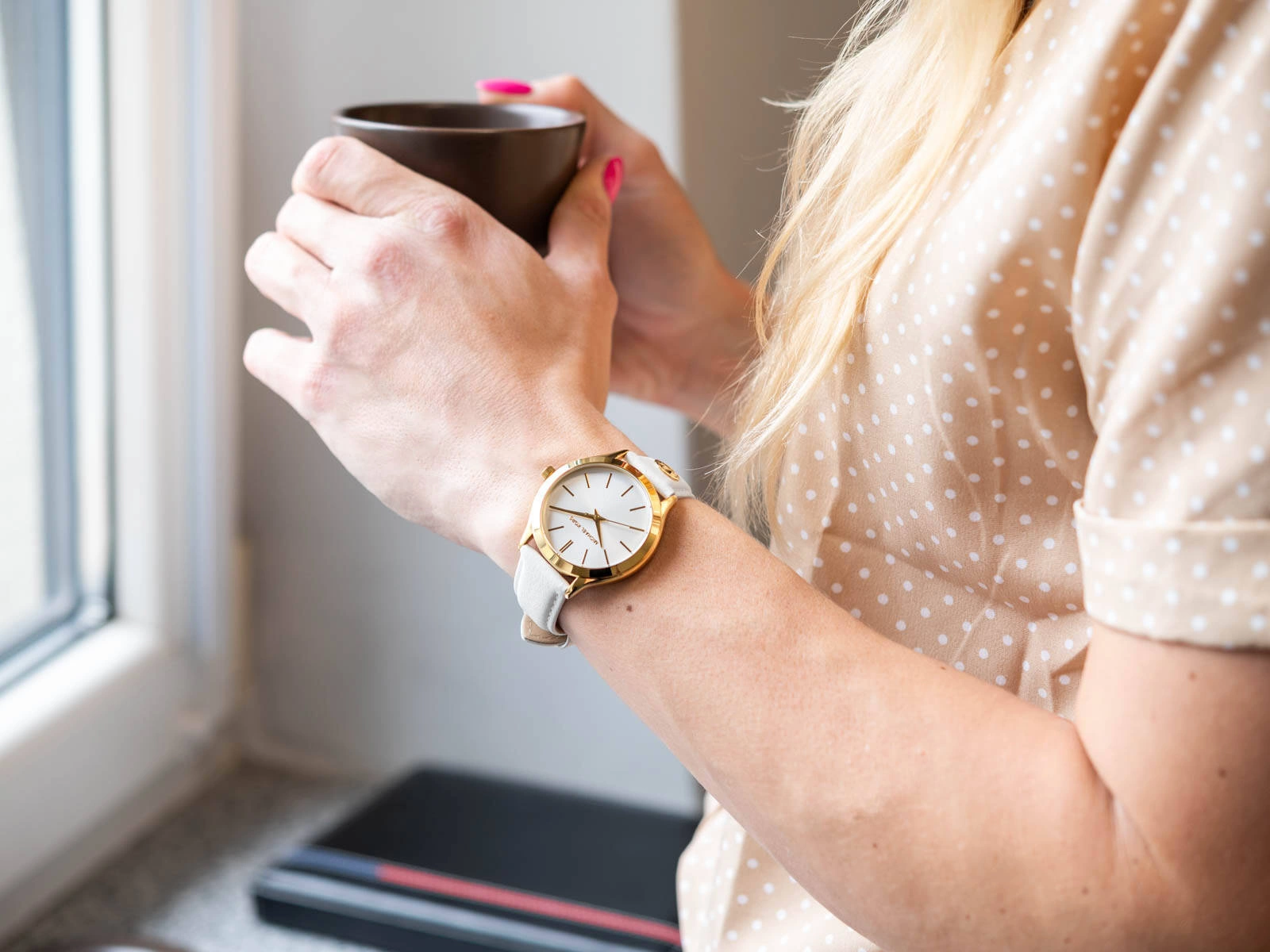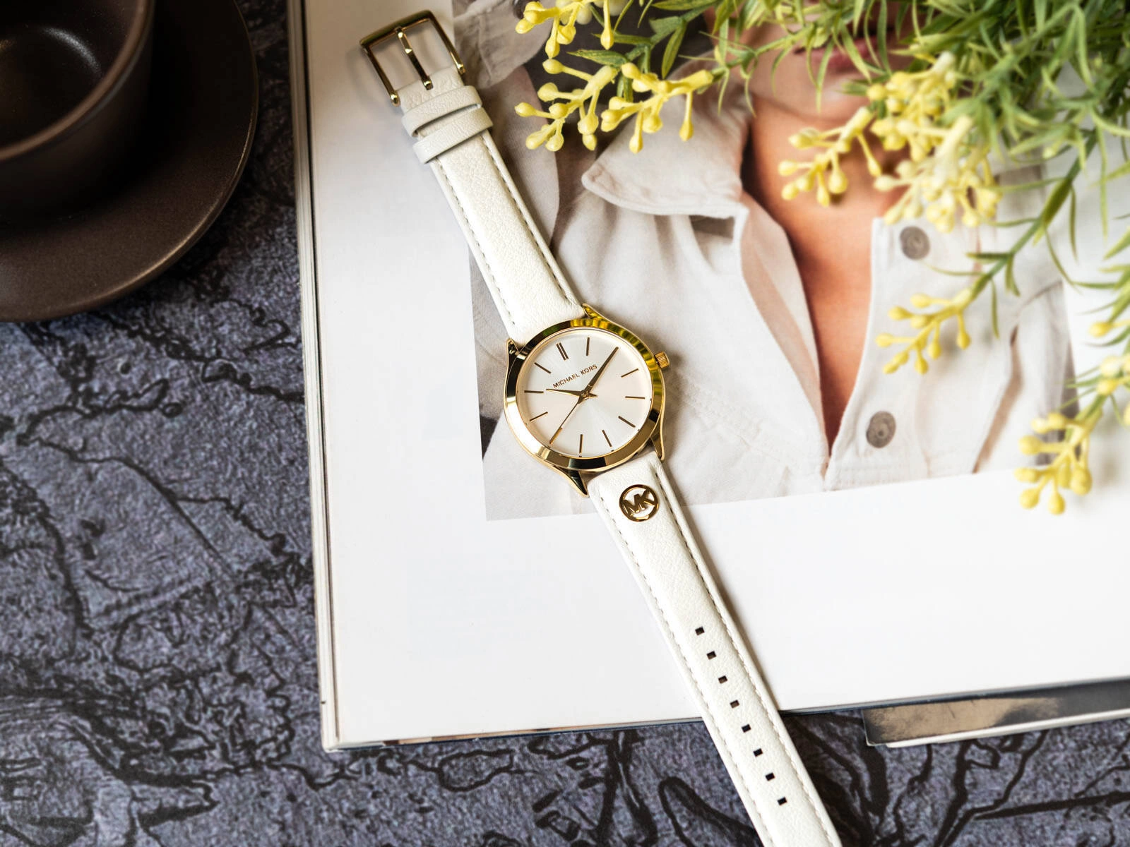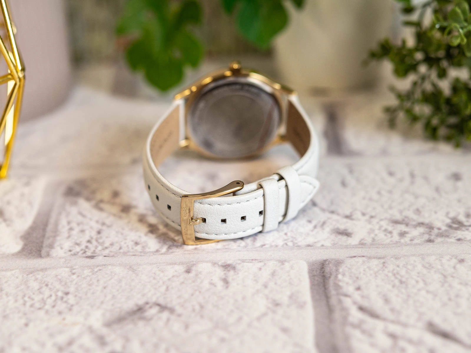 Michael Kors Silm Runway 7466 cechuje się minimalistyczną elegancją i klasycznym połączeniem kolorów, które doskonale wzbogaci każdą stylizację. Wykonana z metalu koperta w kolorze złota została zawieszona na białym skórzanym pasku. Wewnątrz zegarka pracuje zasilany baterią mechanizm kwarcowy, który został zamknięty pod dekielkiem ze stali szlachetnej. Pod przejrzystym płaskim szkiełkiem mineralnym znajduje się minimalistyczna srebrna tarcza z niewielkim złotym logo producenta. Godziny zaznaczone są dobrze kontrastującymi pionowymi indeksami w kolorze złota. Klasa wodoszczelności to 3 ATM, więc zegarek odporny jest na deszcz i zachlapania. Model ten idealnie prezentuje się na kobiecym nadgarstku.