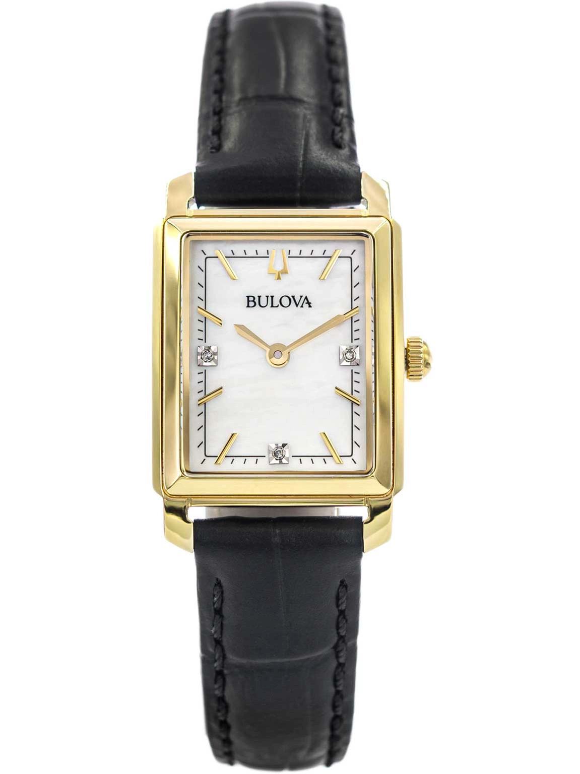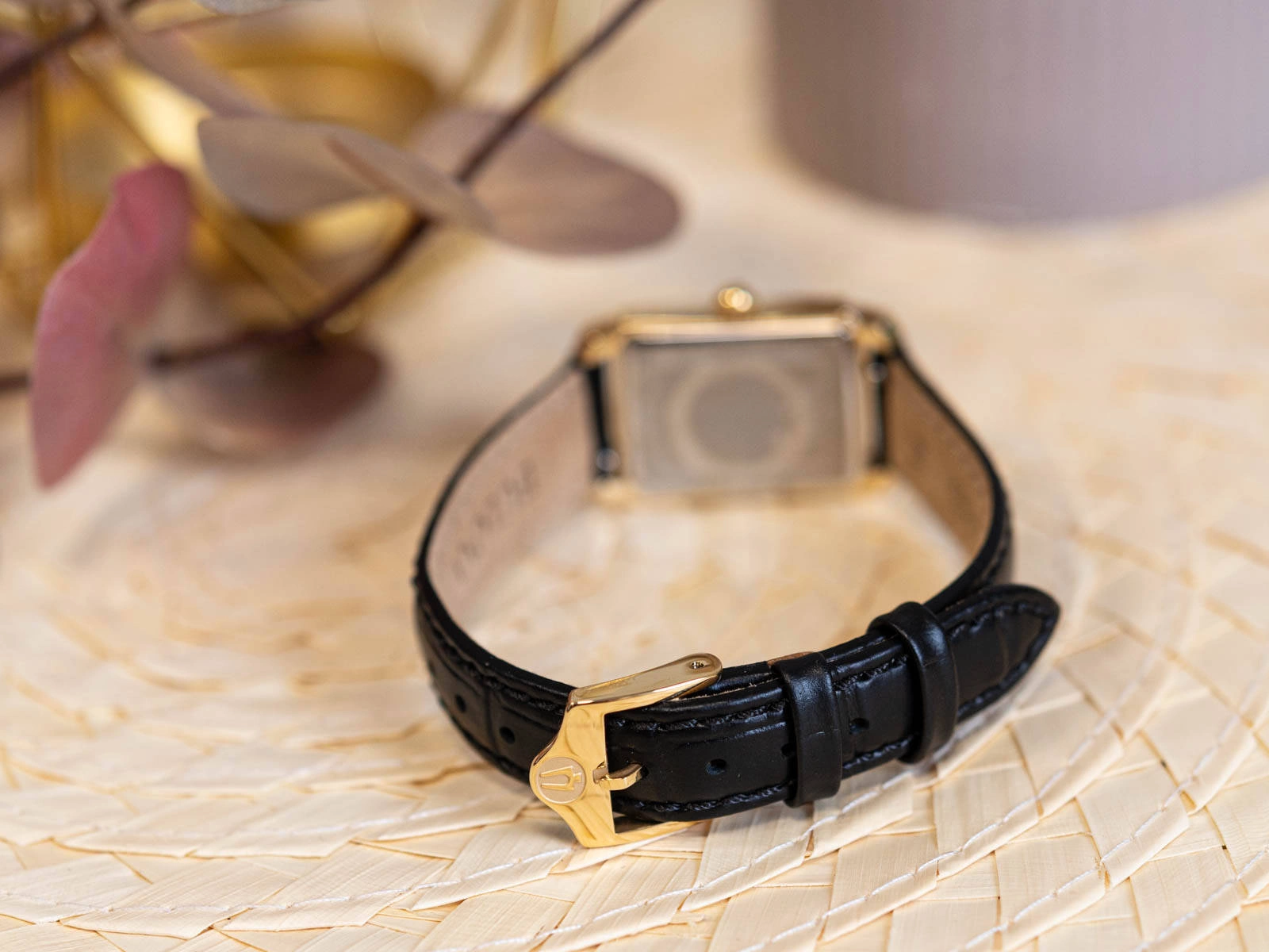 Damski zegarek Bulova 97P166 Sutton to model cechujący się klasyczną kolorystyką i subtelną elegancją. Doskonale zaprojektowana prostokątna koperta, wykonana z wysokiej jakości stali szlachetnej w kolorze złota z błyszczącym wykończeniem i efektownymi fasetowaniami, została zawieszona na wygodnym, czarnym pasku ze skóry naturalnej. Wewnątrz koperty pracuje japoński mechanizm kwarcowy zasilany wymienną baterią. Uwagę przyciąga mieniąca się tarcza z masy perłowej, na której znajdują się czytelne, złote pionowe indeksy. Godziny 3, 6 i 9 są zaznaczone drobnymi diamentami, a godzina 12 złotym, minimalistycznym logo producenta. Tarczę zabezpiecza przejrzyste, wypukłe szkiełko mineralne. Bulova 97P166 Sutton to subtelny, ale jednocześnie luksusowy dodatek, który będzie doskonałym uzupełnieniem zarówno wieczorowej, jak i codziennej stylizacji. Czasomierz zostanie wysłany w eleganckim, firmowym opakowaniu, które z powodzeniem może posłużyć jako pudełko na prezent.