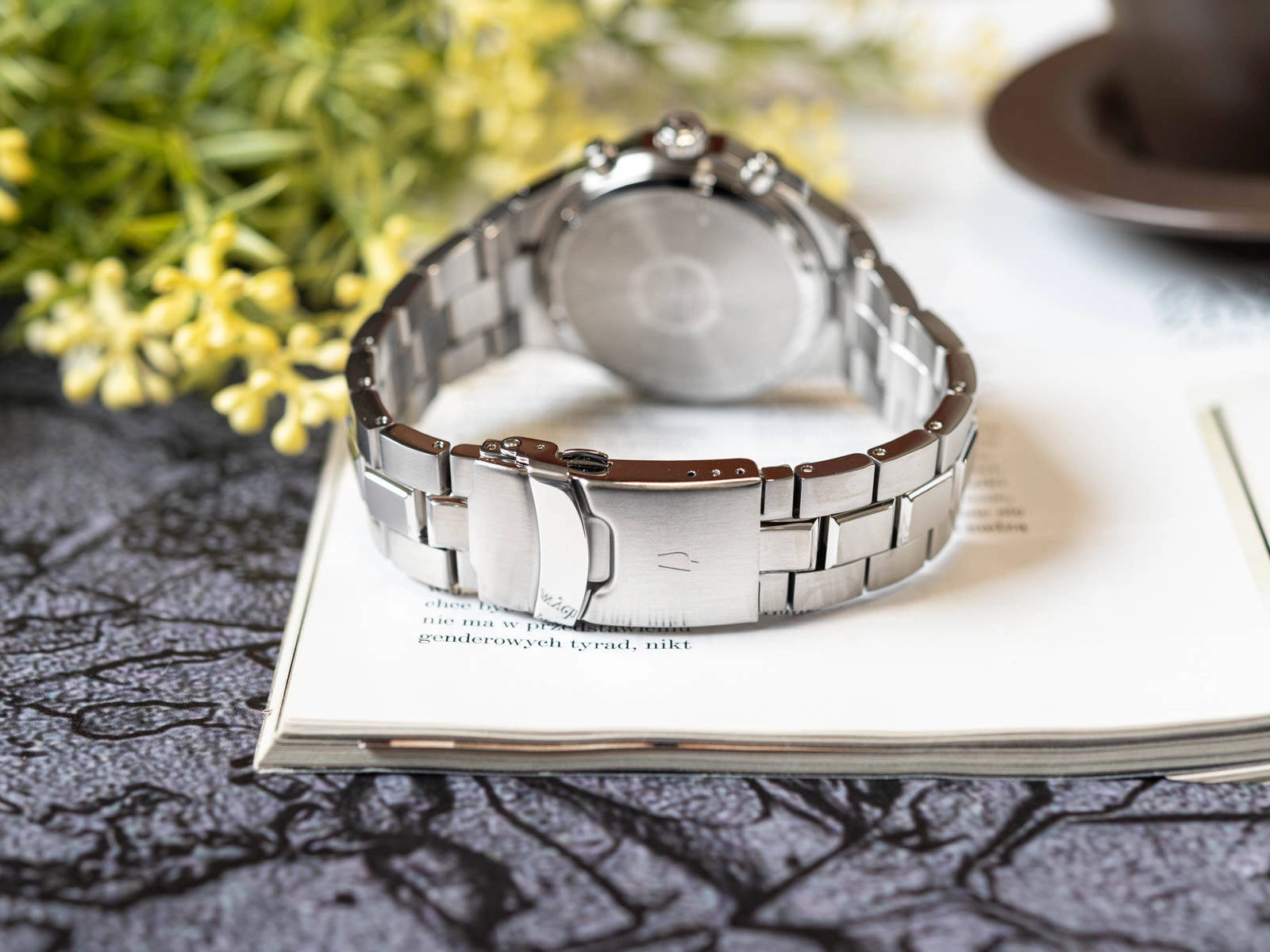 Bulova 96B410 Precisionist to model zaprojektowany dla mężczyzn, którzy cenią precyzyjne i luksusowe dodatki. Solidna, srebrna koperta została połączona z bransoletą w tym samym kolorze. Motylkowe zapięcie bransolety jest proste w obsłudze i zapewnia jej bezpieczeństwo na dłoni, ze względu na dodatkowy element uniemożliwiający przypadkowe odpięcie. Zegarek w całości wykonany został z wysokiej jakości stali szlachetnej odpornej na korozję. Na czarnej tarczy dobrze widoczne są pionowe, srebrno-białe, fosforyzowane indeksy godzinowe, co nie sprawia trudności z odczytem aktualnego czasu. Dodatkowe tarcze na cyferblacie odpowiedzialne są za działanie chronografu. Obsługuje się go za pomocą bocznych przycisków. Atutem jest również datownik wskazujący aktualny dzień miesiąca. Wewnątrz pracuje niezawodny mechanizm kwarcowy. Symbol 262 kHz umieszczony w dolnej części cyferblatu świadczy o tym, że został on zaprojektowany przy pomocy specjalnej technologii Ultra High Frequency. Bezsprzecznie Bulova Precisionist jest modelem zegarka, który przykuwa uwagę. Najwyższej jakości komponenty oraz dbałość o każdy szczegół czynią ten model wyjątkowym. Oryginalne eleganckie pudełko, idealnie nada się do wręczenia na prezent.