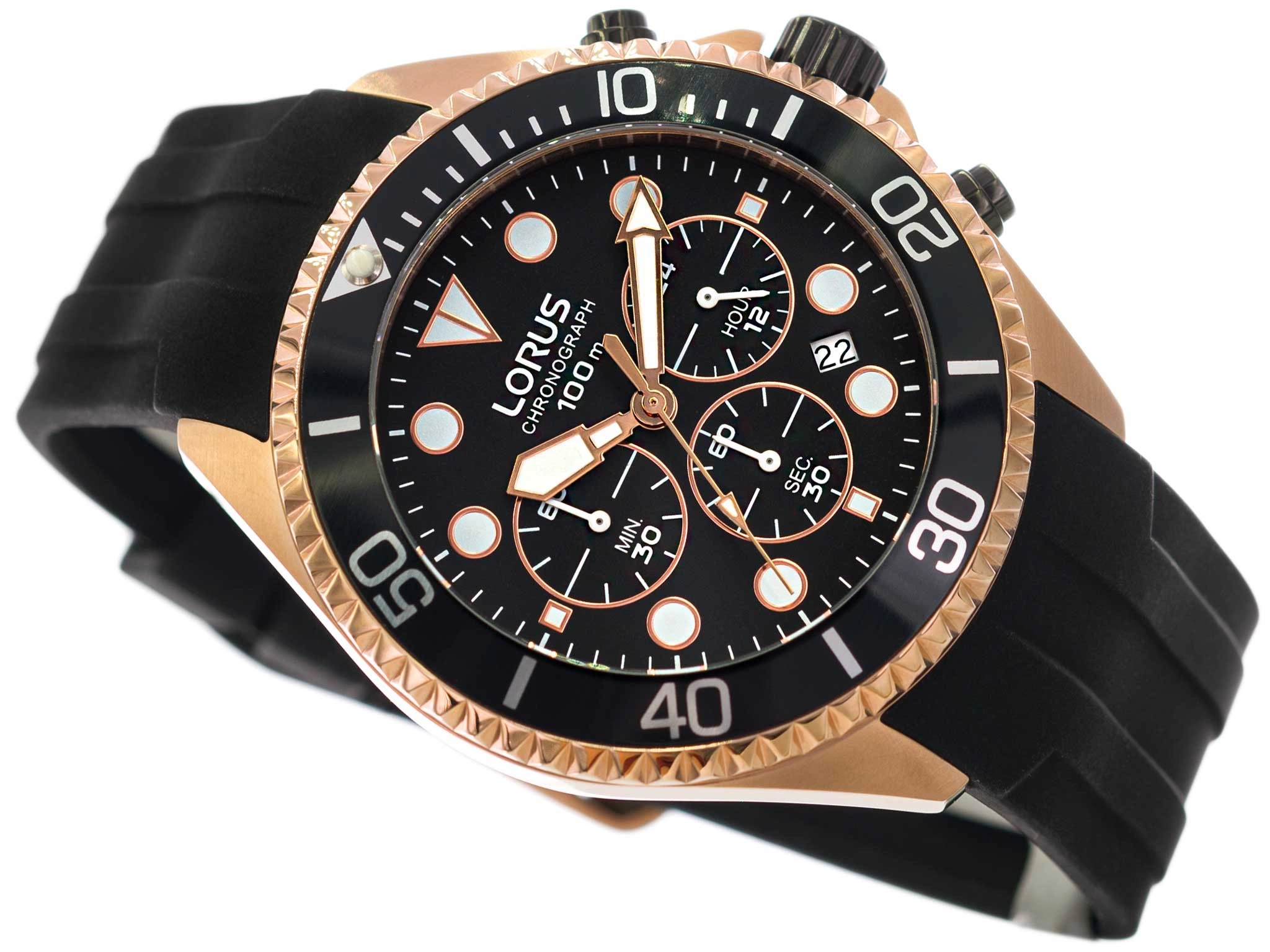 Lorus RT322GX9 Chronograph to połączenie eleganckiej formy i sportowego ducha. Sprawdzi się dla osób doceniających klasyczny design i wysoką jakość. Zasilanie precyzyjnym mechanizmem kwarcowym, gwarantuje niezawodność i długotrwałą pracę. Wieloletnią trwałość zapewnia koperta w modnym kolorze czerwonego złota wykonana ze stali szlachetnej. Zawieszono ją na wygodnym pasku z tworzywa sztucznego. Łatwy odczyt godziny niezależnie od panujących warunków oświetleniowych zapewnia czarna tarcza z białymi indeksami oraz wskazówki z elementami fosforyzującymi neobrite. Cyferblat zabezpiecza przejrzyste szkiełko mineralne. Zegarek wyposażono w stoper analogowy, pozwalający mierzyć czas z dokładnością do 1/10 sekundy do maksymalnie 60 minut, oraz datownik, który wskazuje bieżący dzień miesiąca. Posiada również funkcję zegara dobowego. Klasa wodoodporności na poziomie 100M umożliwia pływanie, chociaż należy pamiętać o tym, żeby nie wciskać przycisków w zanurzonym zegarku. Lorus RT322GX9 doskonale wzbogaci każdą stylizację, będąc praktycznym dodatkiem zarówno w sytuacji formalnej jak i casualowej.