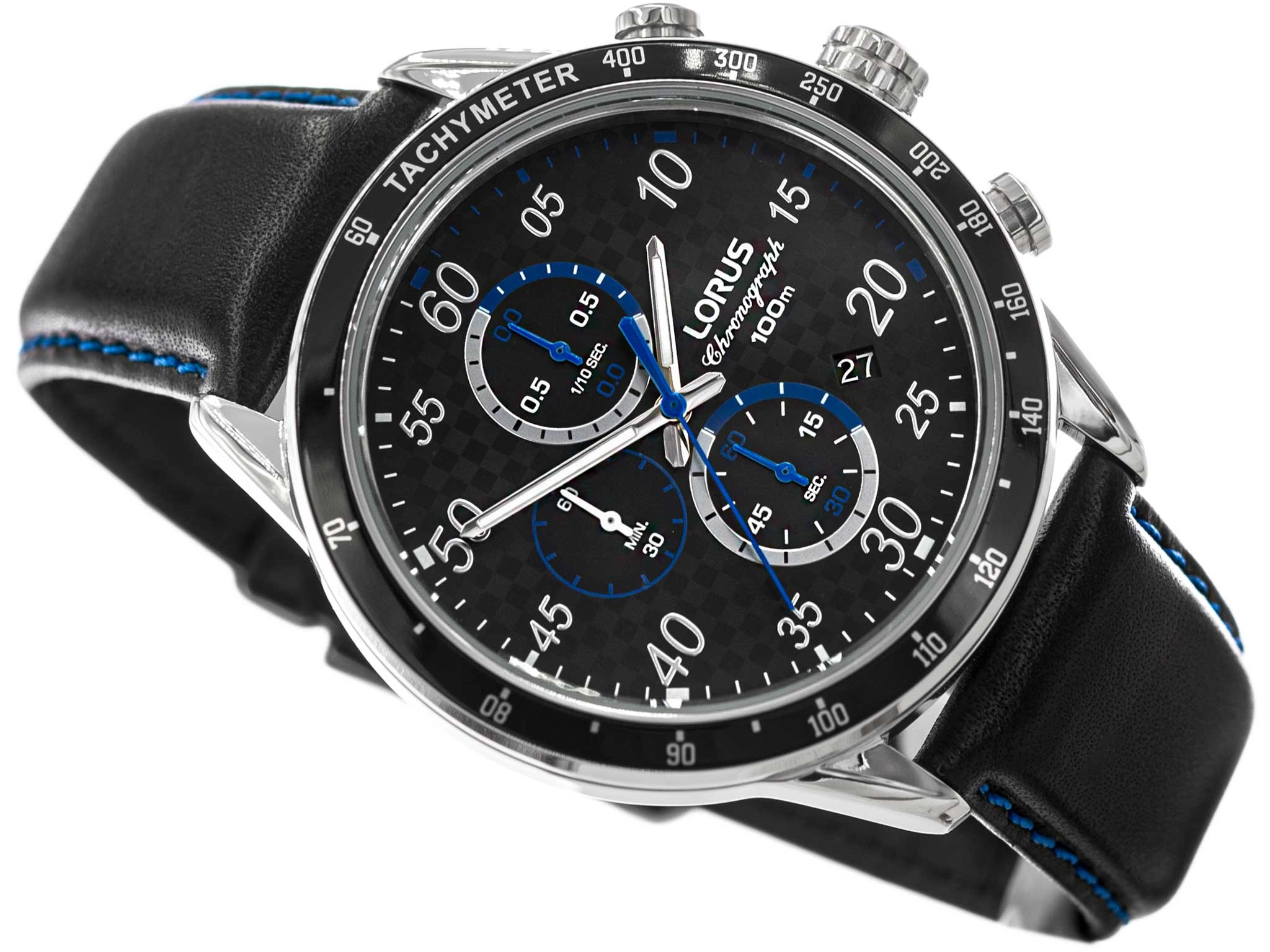 - Wodoszczelny Zegarek Męski Lorus RM341EX9 czarny na pasku, posiada funkcje stopera, datownika i neobrite