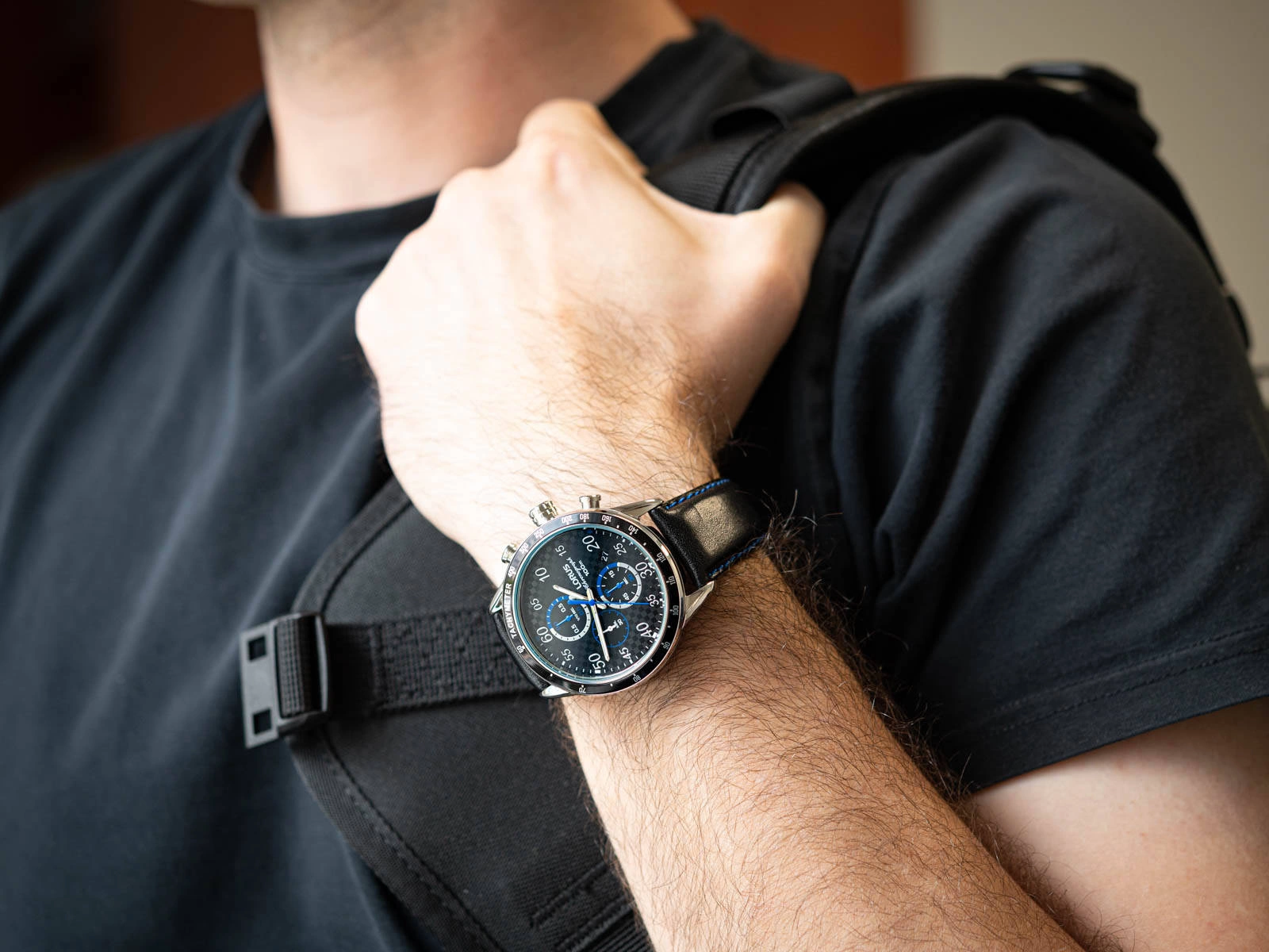 Lorus RM341EX9 Gent Sport Chronograph to doskonały wybór dla osób, które doceniają sportowy design i wysoka jakość wykonania. Duża srebrna koperta wykonana z wysokiej jakości stali szlachetnej, została zawieszona na czarnym skórzanym pasku z wykończeniem wykonanym niebieską nicią. Na pokrytej wzorem szachownicy tarczy umieszczono czytelne srebrne indeksy. Odczytanie godziny w ciemności ułatwiają wyposażone w fosforyzujące elementy neobrite wskazówki. Podkreślone kolorem niebieskim subtarcze odpowiadają za funkcję stopera. Pomiędzy indeksami godziny 4 i 5 znajduje się okienko datownika, wskazującego aktualny dzień miesiąca. Całość zabezpiecza przejrzyste szkiełko mineralne. Wodoodporność na poziomie 100M umożliwia pływanie, pod warunkiem unikania używania przycisków pod wodą. Lorus RM341EX9 to praktyczny i stylowy dodatek, który sprawdzi się zarówno w codziennych jak i formalnych stylizacjach.