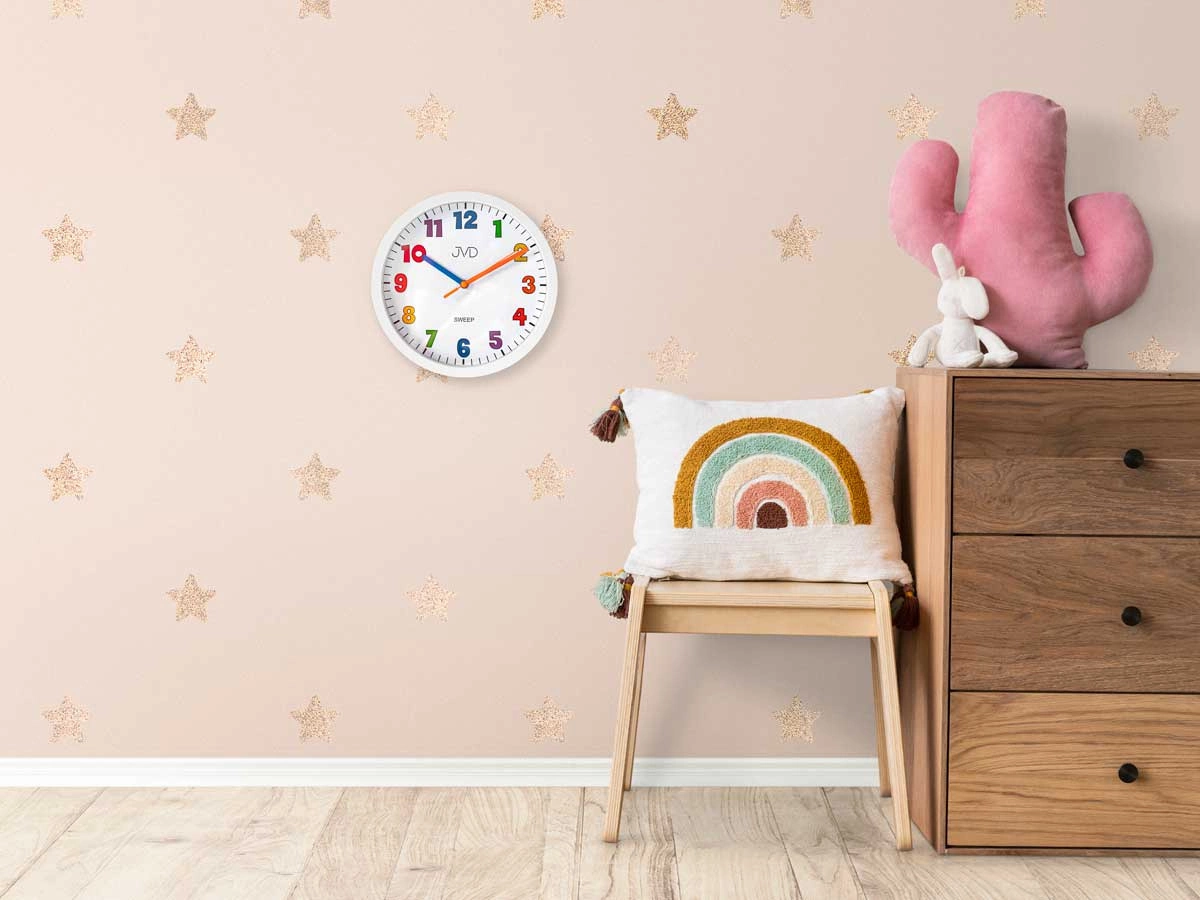 Model JVD HA46.3 to klasyczny analogowy zegar ścienny zaprojektowany specjalnie dla dzieci. Zegar ten korzysta z cichego i dokładnego mechanizmu kwarcowego, co zapewnia niezawodność działania. Jego biała tarcza z kolorowymi cyframi arabskimi i barwnymi wskazówkami, w tym płynnie poruszającym się sekundnikiem, jest bardzo czytelna. JVD HA46.3 to nie tylko funkcjonalny czasomierz, ale również piękny, kolorowy element dekoracyjny do pokoju dziecięcego, pomagający w nauce odczytywania czasu. Zasilany jest baterią LR6 AA, którą dołączamy gratis.