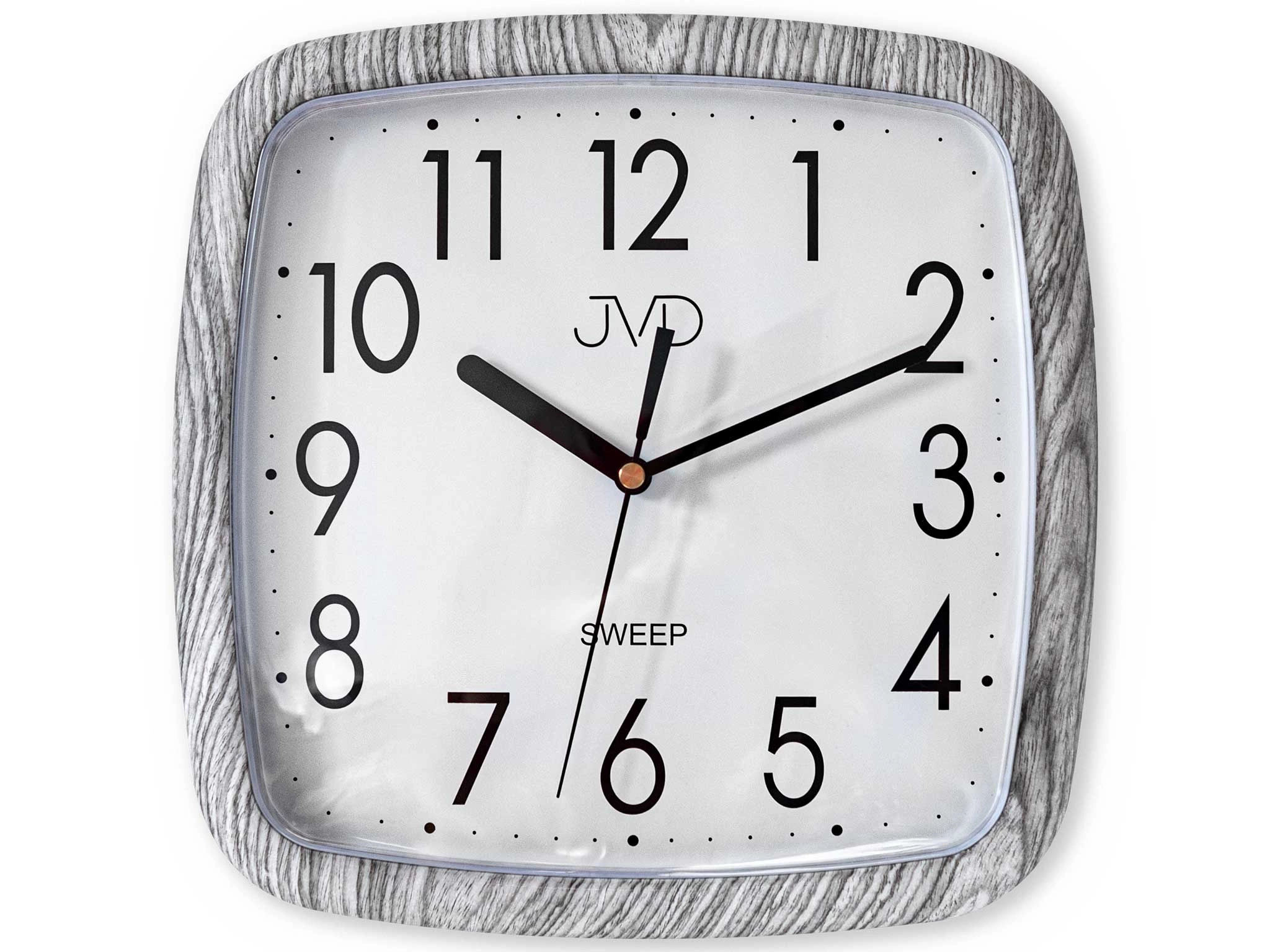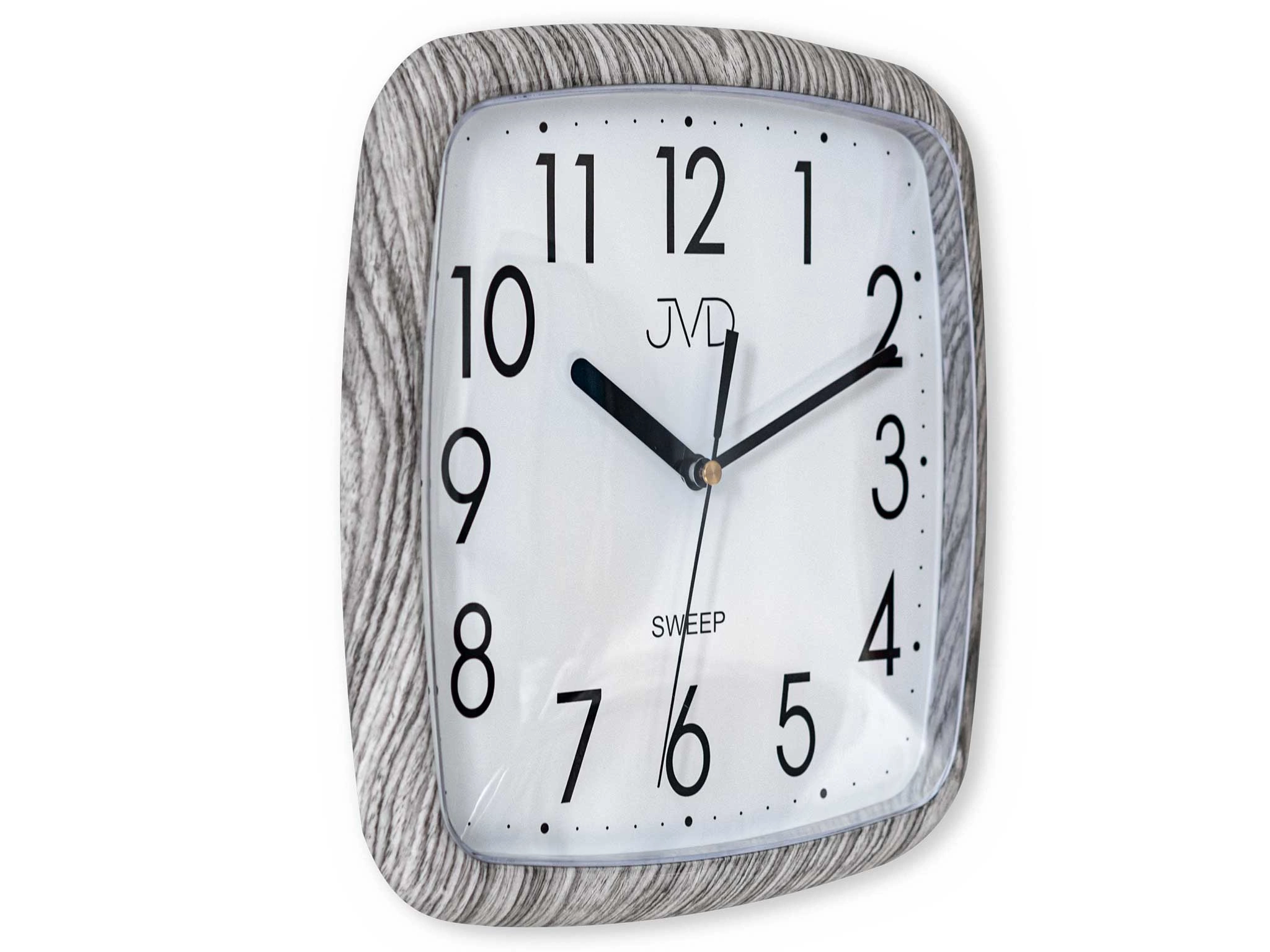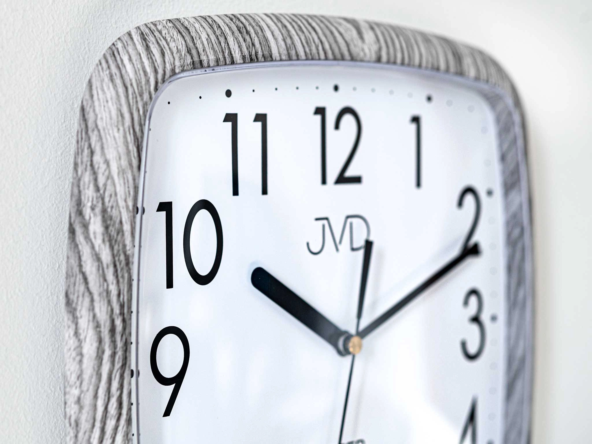 Model JVD H615.19 to klasyczny ścienny zegar analogowy. Dzięki stonowanej kolorystyce stanowi uniwersalny dodatek do każdej aranżacji wnętrza. Obudowa zegara ma wzór imitujący drewno w odcieniach szarości. Zegar posiada cichy i precyzyjny mechanizm kwarcowy, a jego biała tarcza z czarnymi cyframi arabskimi jest łatwa do odczytania. Warto zwrócić uwagę na płynny ruch sekundnika. Bateria jest dołączona gratis.