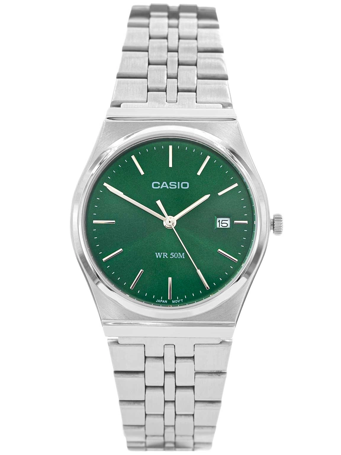 MTP-B145D-3AVEF to kolejna kolorystyczna odsłona zegarka Casio w stylu retro, cieszącego się popularnością wśród miłośników tej marki. Projekt inspirowany jest modą lat 80-tych. Koperta zegarka została umieszczona na srebrnej bransolecie wykonanej z odpornej na korozję stali szlachetnej. Lśniący zielony cyferblat z szlifem słonecznym, chroniony szkłem mineralnym, ozdobiono kontrastującymi pionowymi indeksami. Przy godzinie 3 znajduje się datownik pokazujący aktualny dzień miesiąca. Zegarek ma klasę wodoszczelności 50M, co pozwala na bezproblemowy kontakt z wodą. Wewnątrz znajduje się japoński mechanizm kwarcowy, zasilany baterią. Model MTP-B145D-3AVEF przypadnie do gustu mężczyznom, którzy doceniają tradycyjny design, ale lubią także wyróżniać się dzięki odważnej kolorystyce.
