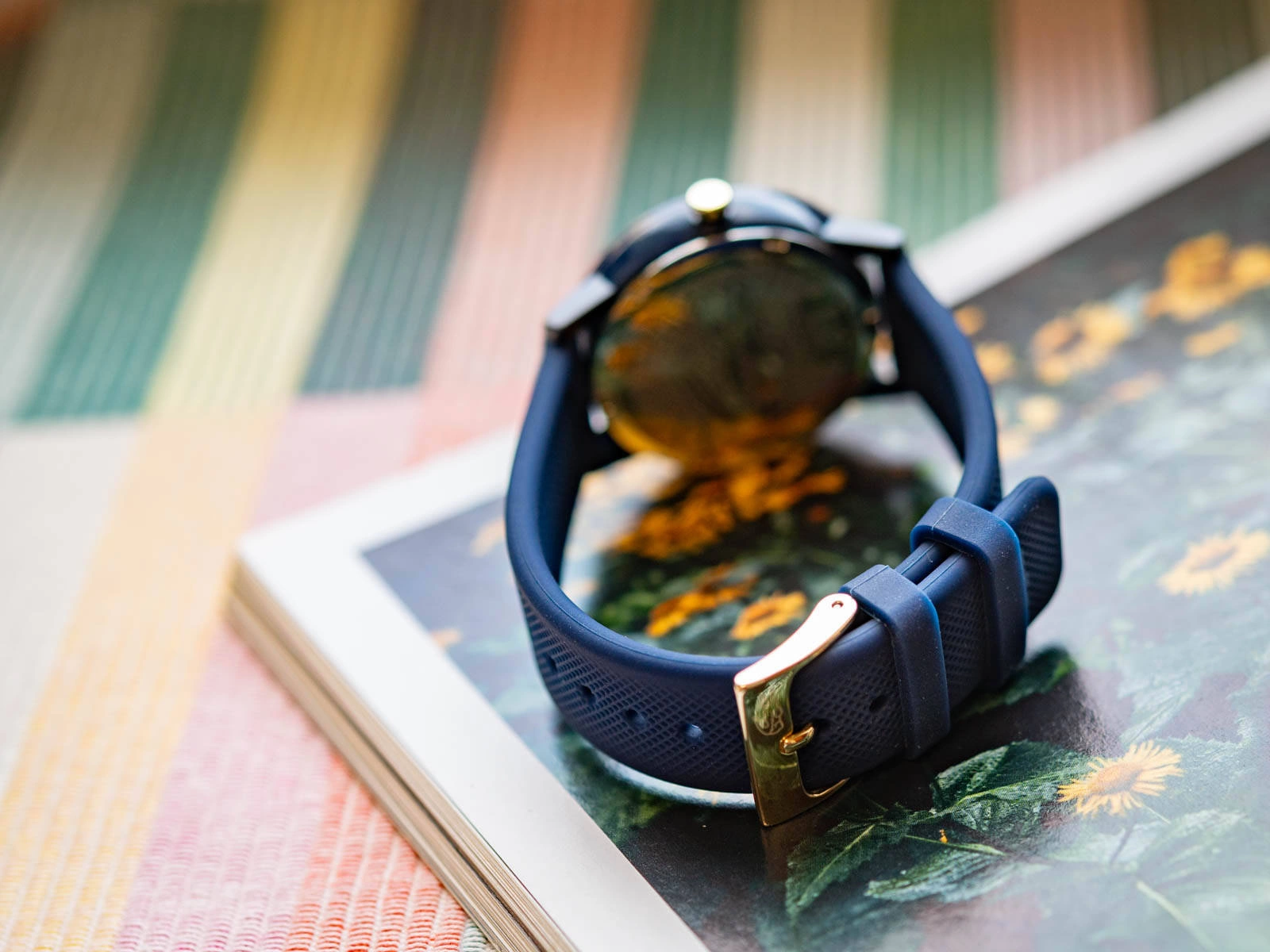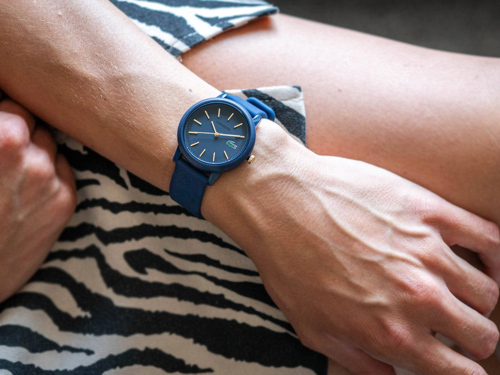 Lacoste 2001271 to damski model cechujący się prostym wzornictwem i modnym kolorem Navy Blue. Koperta została połączona z elastycznym paskiem z tworzywa sztucznego z tłoczeniem. Pasek jest niezwykle wygodny i dopasowuje się do kobiecego nadgarstka. Minimalistyczna tarcza prezentuje złote wskazówki i indeksy, które tworząc kontrast nie sprawiają problemu z odczytem godzin. Przy godzinie 3 umieszczono logo w postaci krokodyla. Cyferblat chroni szkło mineralne, które odporne jest na wszelkie zarysowania. Lacoste 2001271 bez wątpienia wpiszę się w casualowy look i ubarwi niejedną stylizację. Do zegarka dołączone zostało eleganckie, markowe pudełko, które doskonale sprawdzi się jako opakowanie na prezent.