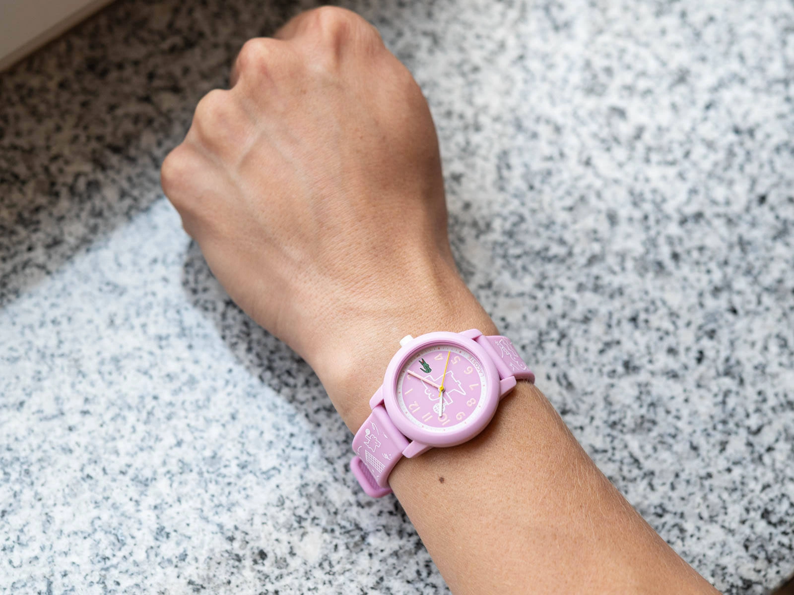 Lacoste L12.12 2030058 to produkt zaprojektowany z myślą o najmłodszych. Ze względu na swoje niewielkie rozmiary będzie wspaniale prezentował się na drobnej, dziewczęcej dłoni. Koperta została zawieszona na wygodnym pasku z odpornego tworzywa sztucznego ozdobionym wizerunkami krokodyla z logo firmy w komiksowym stylu. Cała konstrukcja jest bardzo lekka i wygodna. Na cyferblacie umieszczono wyraźnie kontrastujące indeksy w postaci cyfr arabskich, które ułatwią odczyt godziny, zwłaszcza dzieciom, które rozpoczynają przygodę z czasem. Dodatkowo tarczę ozdabia logo producenta w postaci charakterystycznego krokodylka. Wewnątrz działa precyzyjny mechanizm kwarcowy zasilany wymienną baterią. Model Lacoste 2030058 posiada w zestawie dedykowane pudełko od producenta, które sprawdzi się zarówno jako opakowanie na prezent jak i podczas przechowywania zegarka.