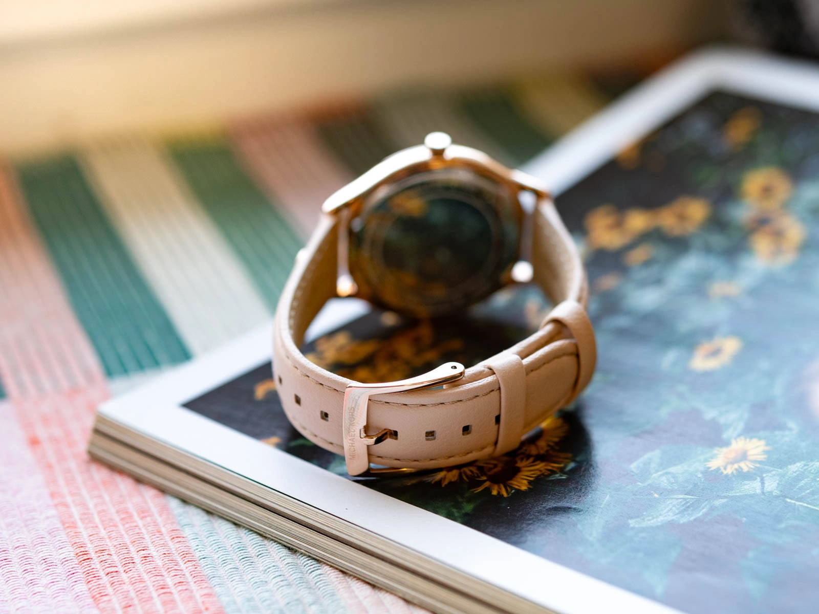 Michael Kors Silm Runway MK7467 to wyjątkowy dodatek, który wzbogaci każdy rodzaj stylizacji. Metalowa koperta modnym kolorze różowego złota została połączona ze skórzanym paskiem w kolorze pudrowego różu. Mechanizm kwarcowy zasilany baterią znajduje się pod dekielkiem ze stali szlachetnej. Srebrna tarcza z subtelnym logo producenta jest chroniona płaskim, mineralnym szkiełkiem. Pionowe indeksy dopasowane do kolorystki koperty dobrze kontrastują z ozdobioną szlifem słonecznym tarczą. Zegarek posiada wodoszczelność 3 ATM, co czyni go odpornym na deszcz i zachlapania. Model ten doskonale komponuje się na kobiecym nadgarstku.