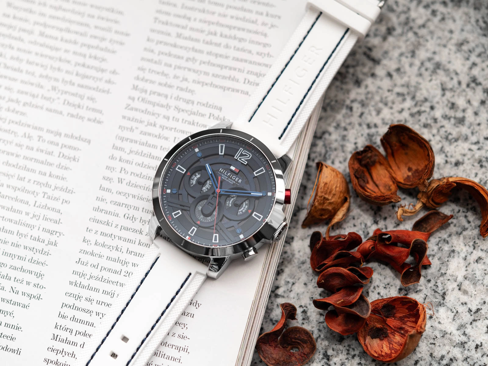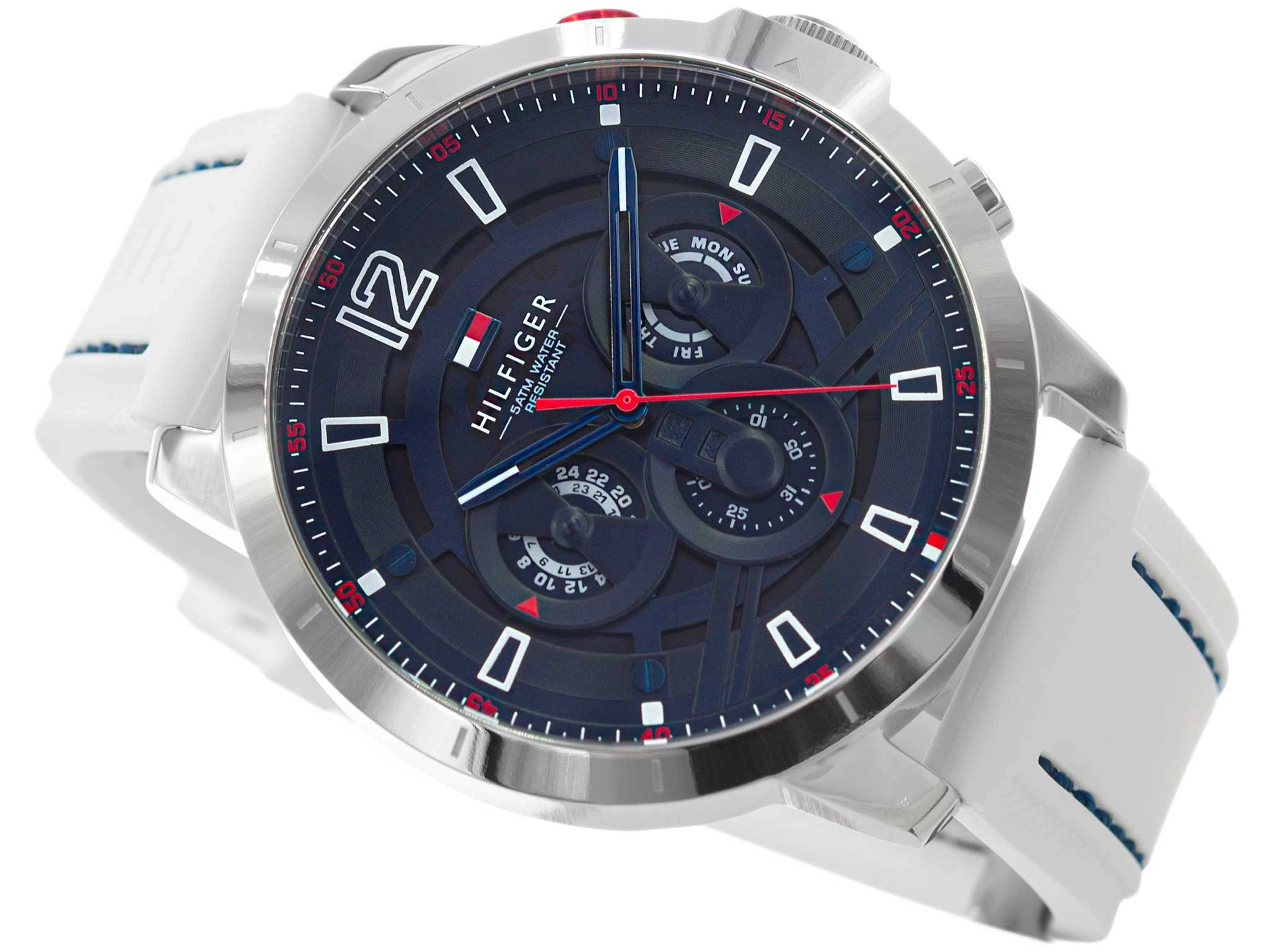 - Zegarek Męski Tommy Hilfiger 1792148 biały na pasku, posiada funkcję datownika.