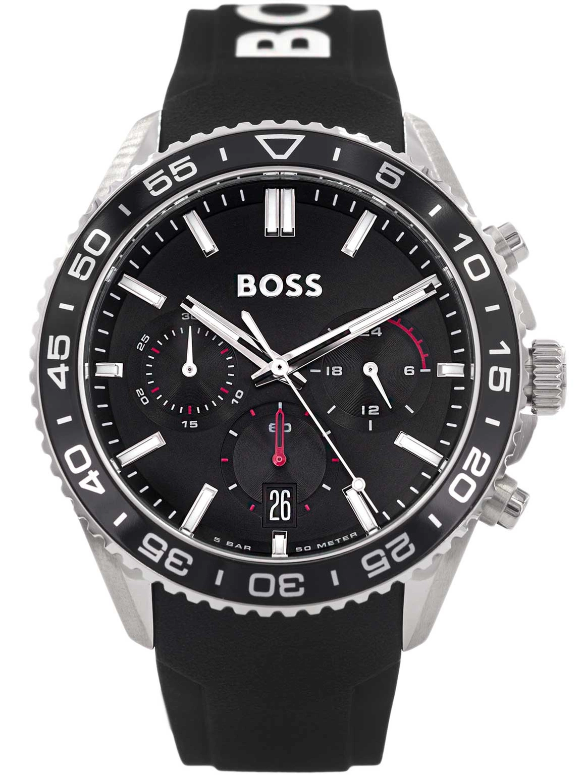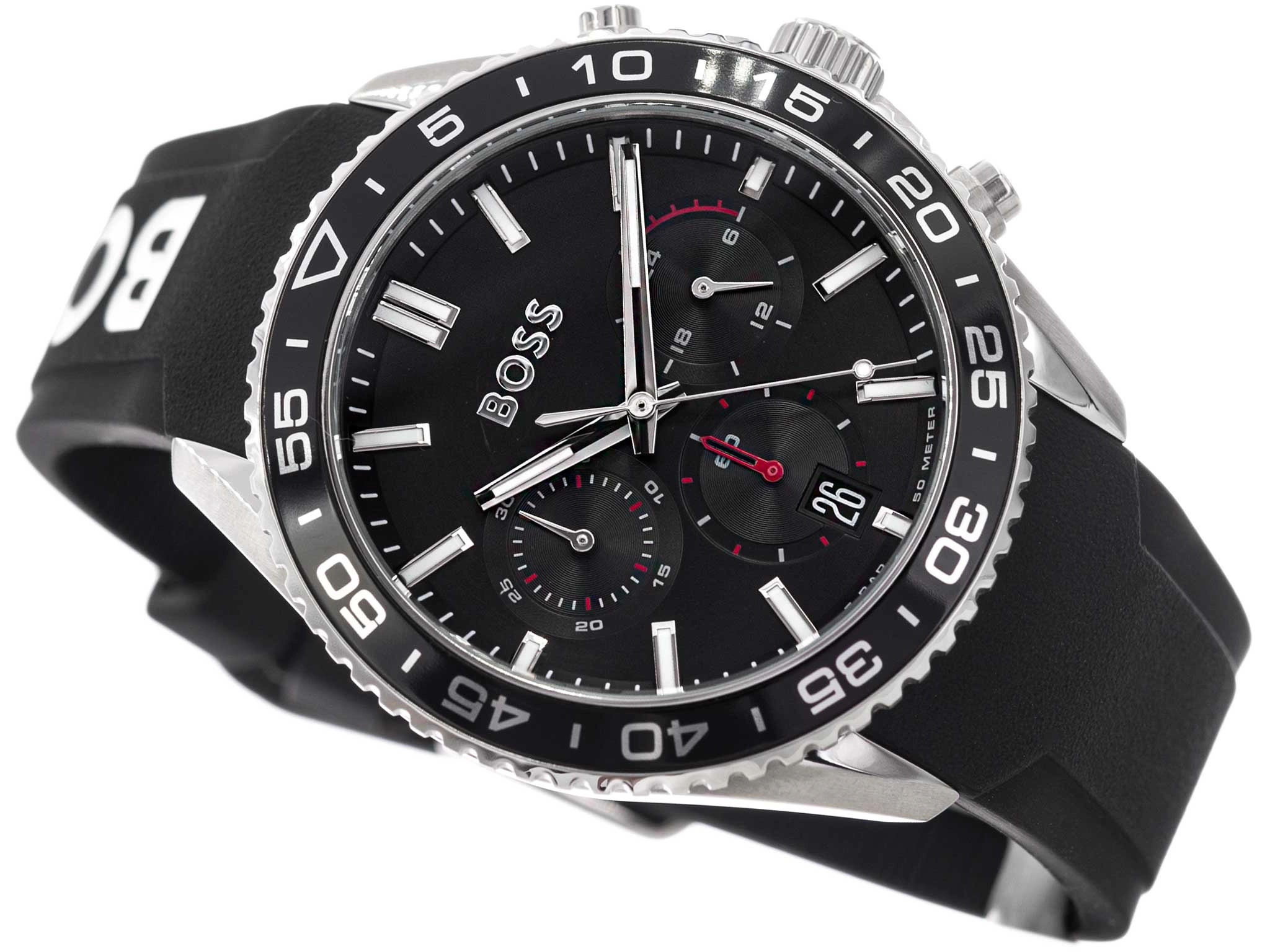 - Zegarek Męski Hugo Boss 1514141 czarny na pasku, posiada funkcje takie jak stoper i datownik.