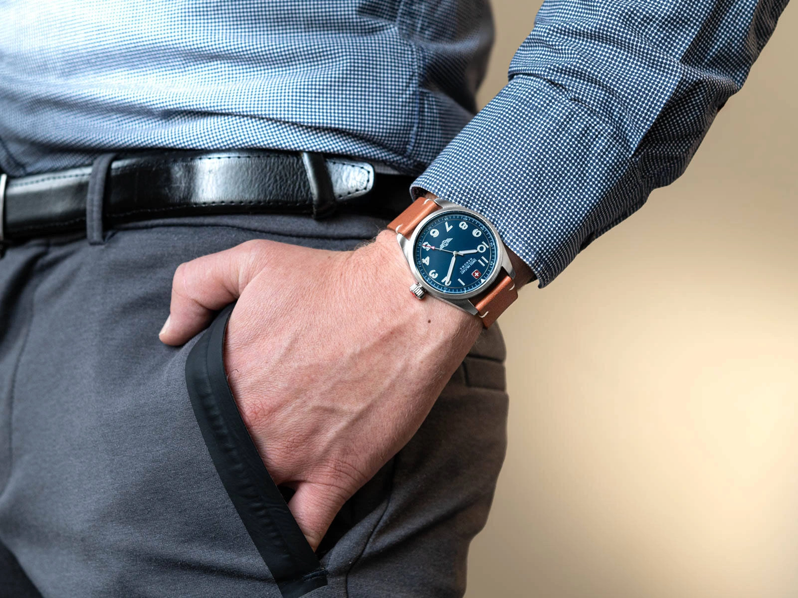 Męski zegarek Swiss Military Hanowa SMWGA2100402 Falcon to elegancki tradycyjny zegarek analogowy i przykład szwajcarskiej precyzji, który zadowoli nawet najbardziej wymagających użytkowników. Srebrna koperta, wykonana z wysokiej jakości stali szlachetnej, nie tylko prezentuje się stylowo, ale także gwarantuje trwałość i odporność na uszkodzenia. W jej wnętrzu kryje się precyzyjny mechanizm kwarcowy zasilany baterią, który zapewnia niezawodność i dokładność działania. Matowy cyferblat w kolorze granatowym stanowi doskonałe tło dla dobrze kontrastujących biało-srebrnych indeksów w postaci cyfr arabskich, a czerwone logo z szwajcarskim krzyżem umieszczone na godzinie dwunastej dodaje całości charakteru. Indeksy i wskazówki zostały wyposażone w fosforyzujące elementy neobrite, które po naświetleniu świecą przez jakiś czas, umożliwiając łatwe odczytanie godziny w ciemności lub przy słabym oświetleniu. Cyferblat chroni odporne na zarysowania szkło szafirowe. Dzięki temu tarcza zegarka pozostaje nienaruszona nawet przy intensywnym użytkowaniu. Klasa wodoszczelności 10ATM pozwala na pływanie z zegarkiem na ręce. Elegancji dodaje zegarkowi brązowy pasek wykonany z naturalnej skóry, który nie tylko doskonale dopasowuje się do nadgarstka, ale również jest niezwykle wygodny w noszeniu. Zapięcie na sprzączkę zapewnia pewność i łatwość zakładania. Swiss Military Hanowa SMWGA2100402 Falcon jest zapakowany w eleganckie, oryginalne opakowanie producenta, które doskonale sprawdzi się jako opakowanie na prezent.